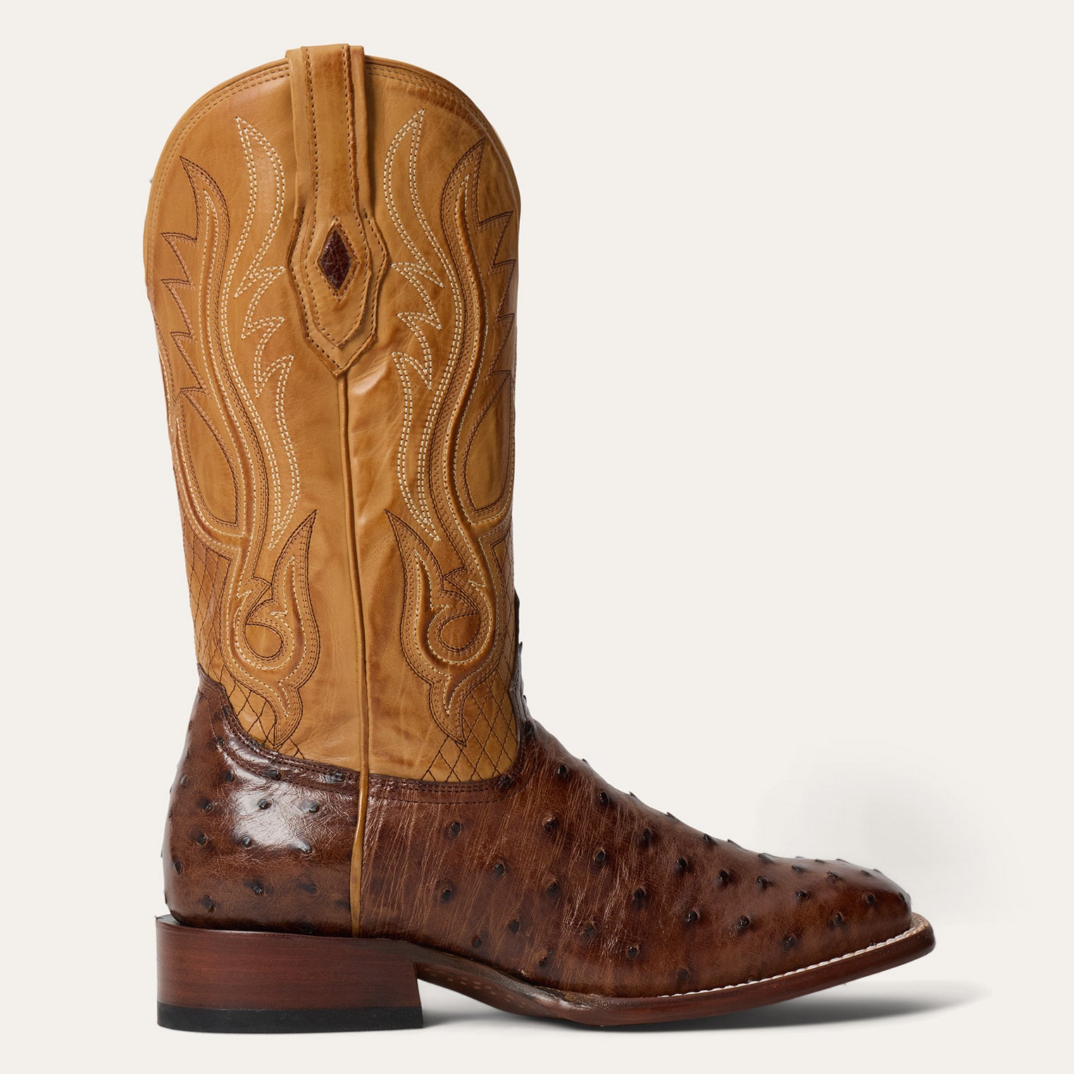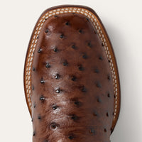 A square toe exotic boot that combines a working cowboy silhouette with luxury materials, the Ozzy Ostrich Boot features a full Ostrich vamp and 13” calf leather shaft with intricate hand stitching and cording. It has a square toe—a popular working style that provides maximum all-day comfort—and channel welted full leather construction with 56 lemonwood pegs and eight premium brass nails per boot. The beveled bottom sole is thinned out toward the edges, creating a rounded, tapered appearance around the arch. A hand-stacked leather heel, premium cow leather lining, and a leather-lined Poron insole ensure comfort in every step.