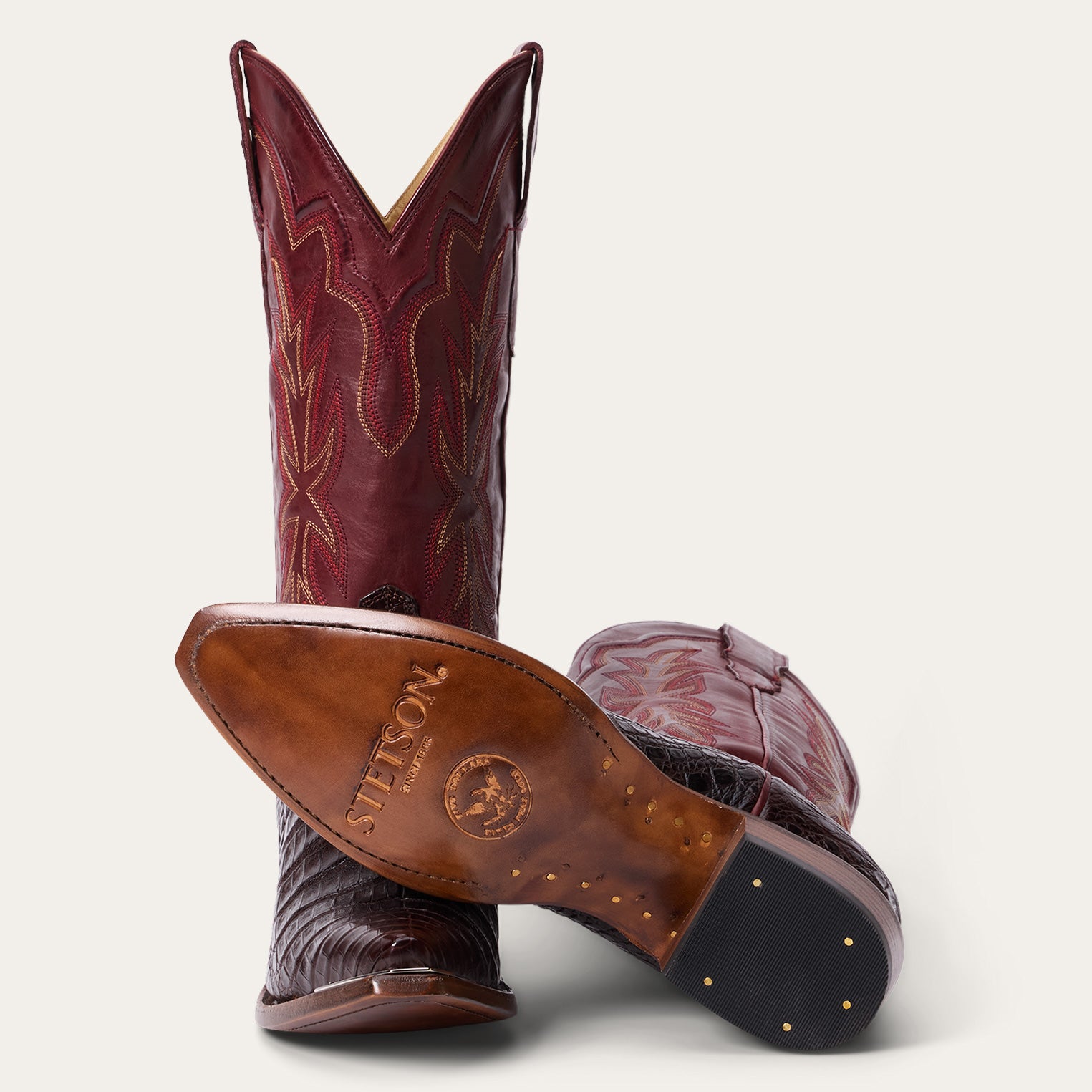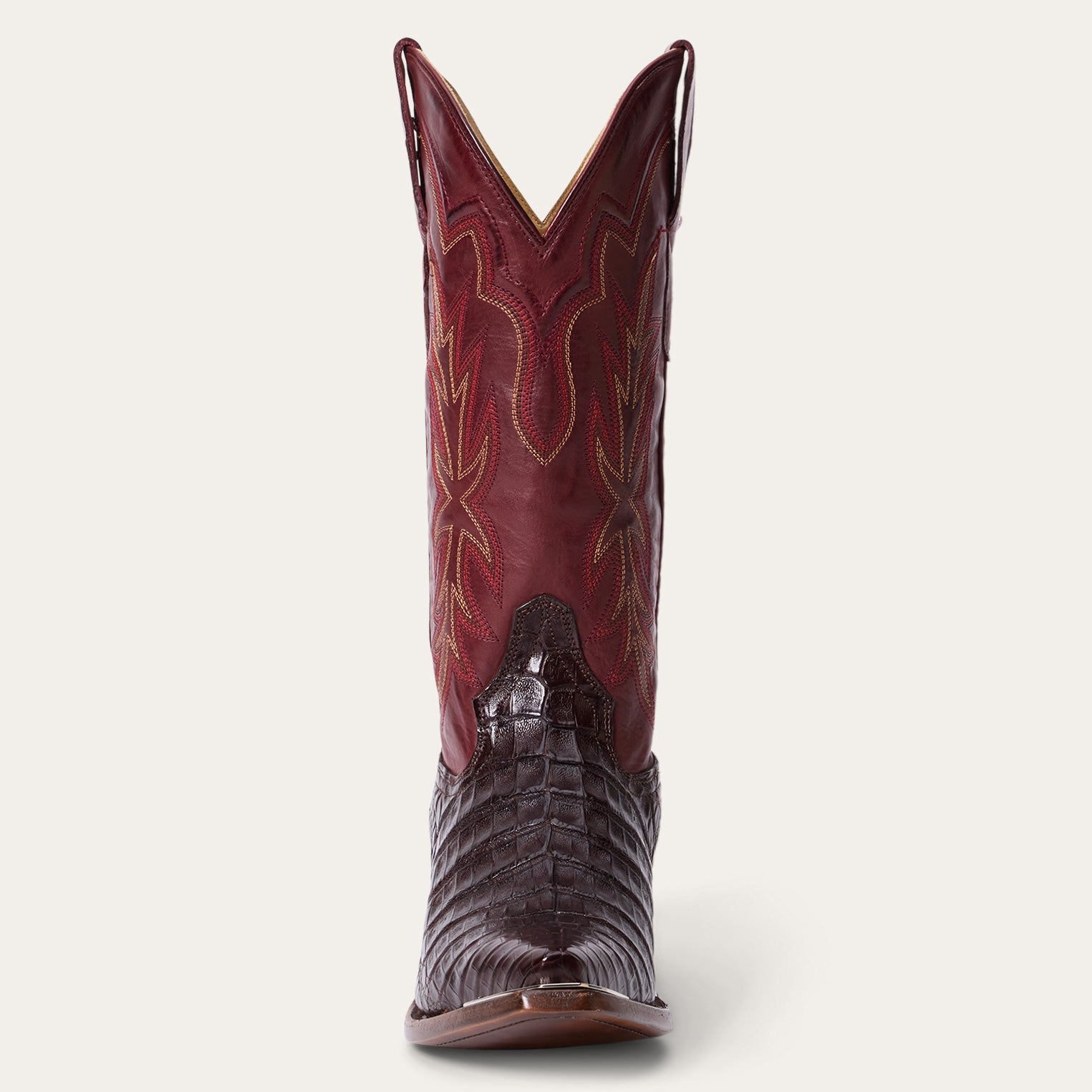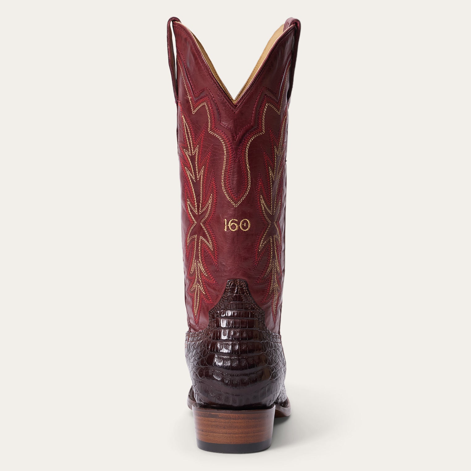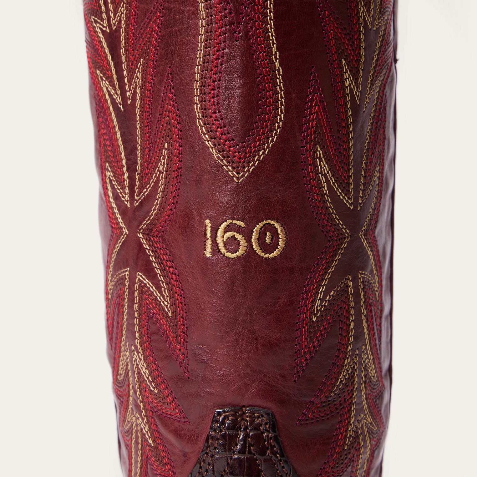 This limited-edition boot combines a timeless western silhouette with luxury materials to create a boot worthy of our 160th anniversary. It features a chocolate caiman vamp—prized for its distinctive texture and natural variation—paired with a 13” wine leather shaft with intricate embroidery. Its snip toe—a statement-making style—is finished with an antique silver toe tip. An all-leather sole, crafted with lemonwood pegs and brass nails, provides a firm foundation, while a cushioned leather insole and premium cowhide leather lining ensure heel-to-toe comfort in every step.