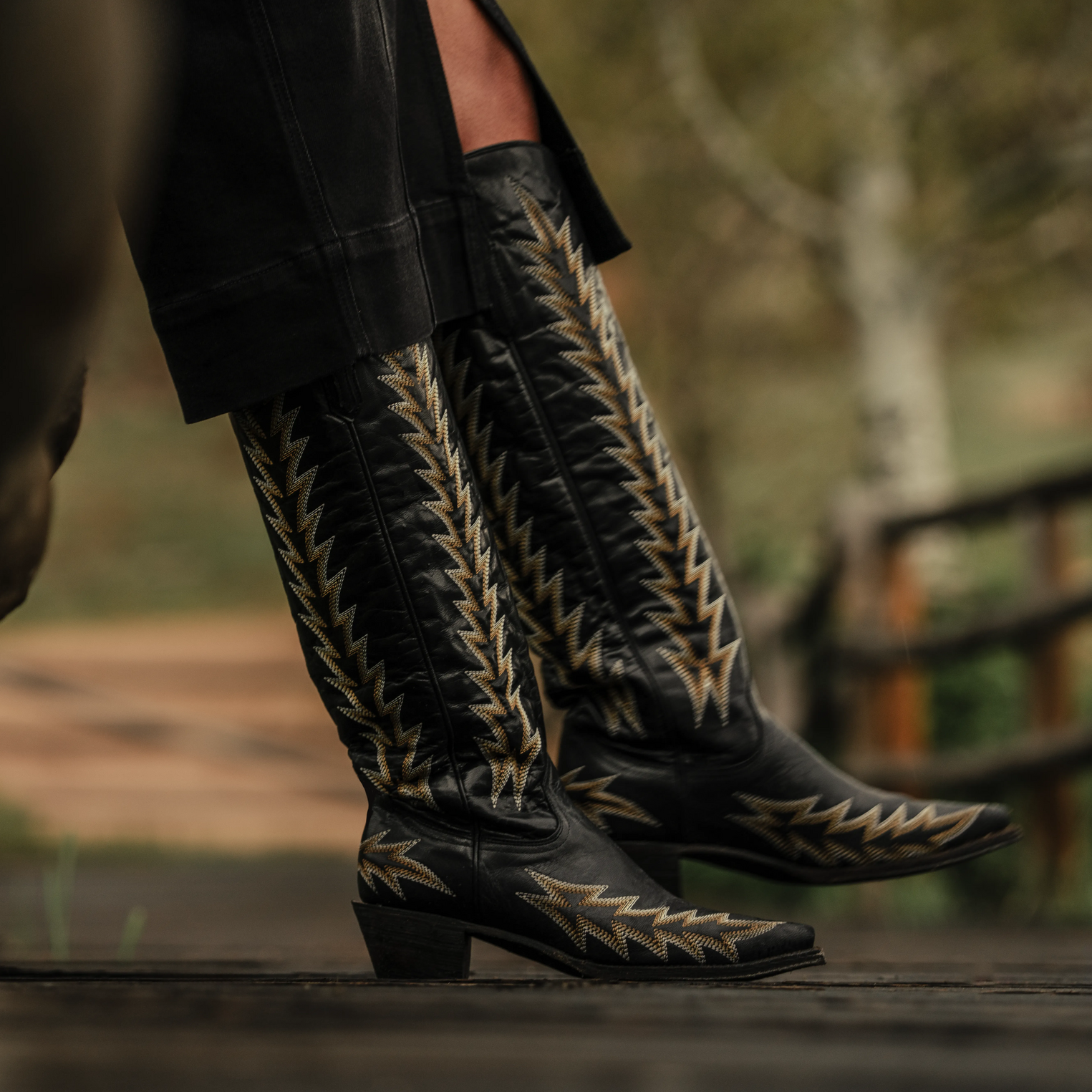 The statement-making Sarah Boots have a Goat Leather Vamp and 18” Shaft and a unique vintage flame embroidery. Additional details include a stacked heel, premium leather lining, premium brass nails and hand-driven lemonwood pegs that enable the boot to withstand the elements by expanding and contracting with any moisture the boot may encounter. Our western boots are handcrafted with the same care and consideration that goes into our legendary headwear, resulting in the ultimate mix of heel-to-toe comfort, durability, and classic Western style. Their rugged construction is fit for a lifetime of adventure, with high-quality leathers that will develop an attractive patina over time and conform to the wearer, providing years of reliable service.