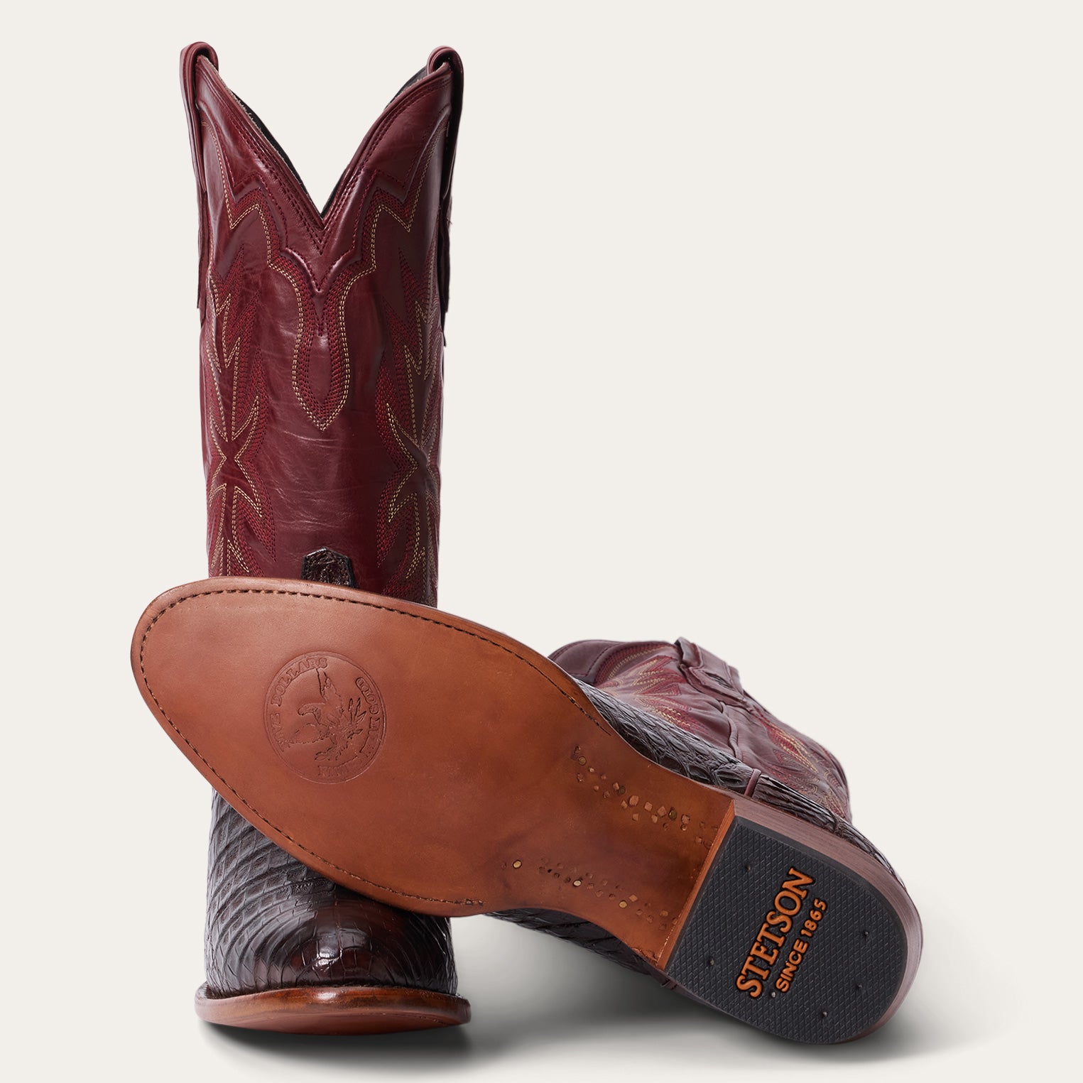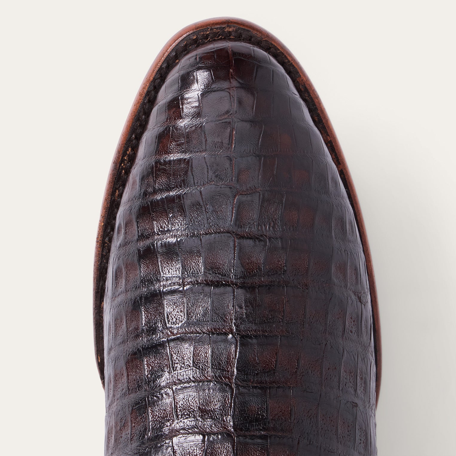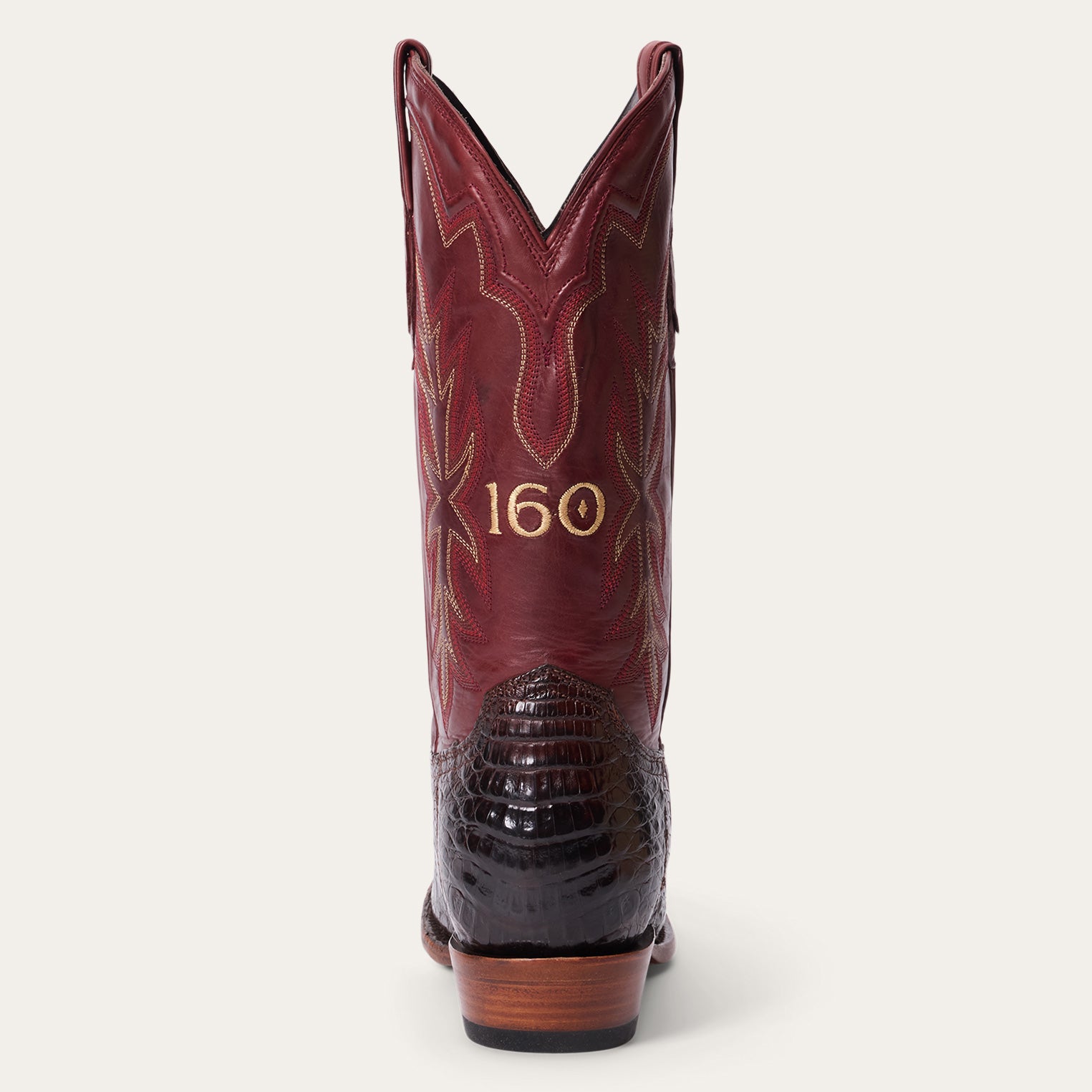 This limited-edition boot combines a timeless western silhouette with luxury materials to create a boot worthy of our 160th anniversary. It features a chocolate caiman vamp—prized for its distinctive texture and natural variation—paired with a 13” wine leather shaft with intricate embroidery and a versatile R toe. An all-leather sole, crafted with lemonwood pegs and brass nails, and a hand-stacked leather heel provides a firm foundation, while a cushioned leather insole and premium cowhide leather lining ensure all-day comfort.
