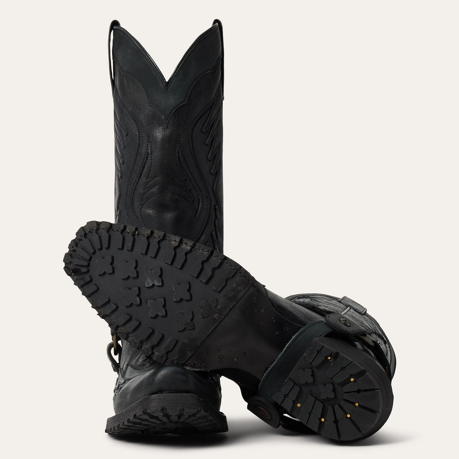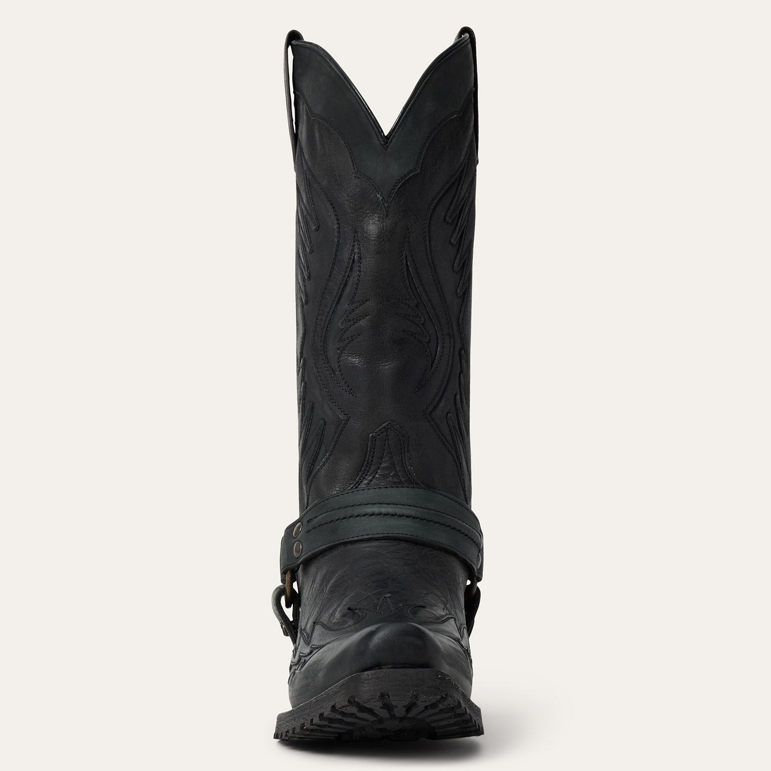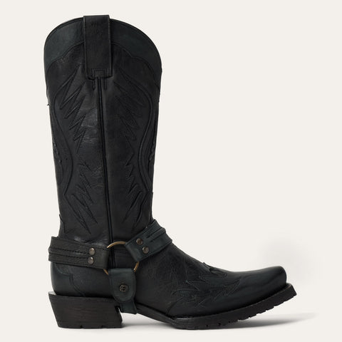 The rugged outlaw biker harness boot features a leather wingtip vamp and 13” leather wing shaft with intricate hand stitching. It has an outlaw toe—a rugged, modern style with a streamlined edge that splits the difference between square and snip toes—and a hand-stacked leather heel. The construction features a single welt and lug sole for added traction, along with a removable harness. Inside, a cushioned insole and premium cowhide leather lining provide lasting support and comfort.