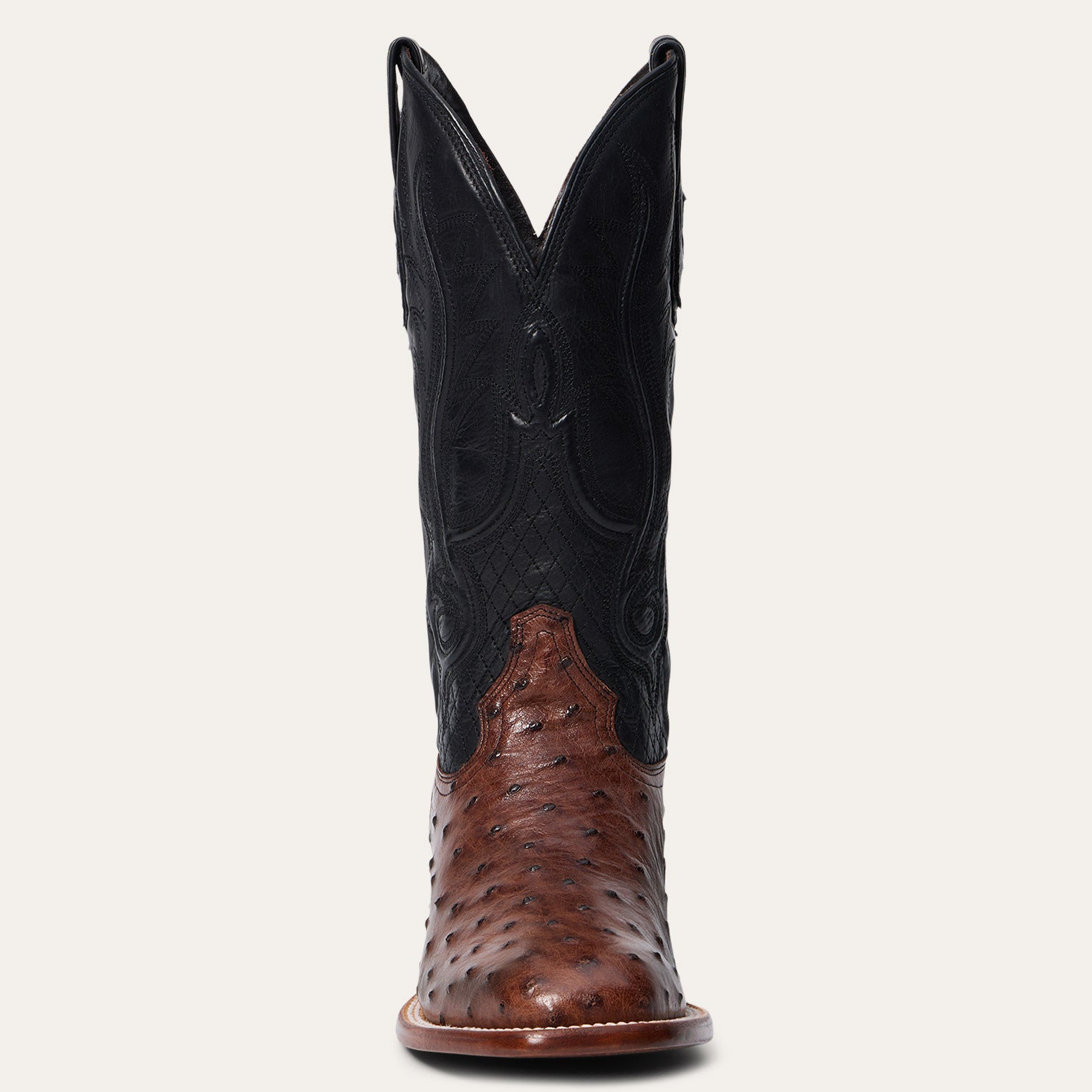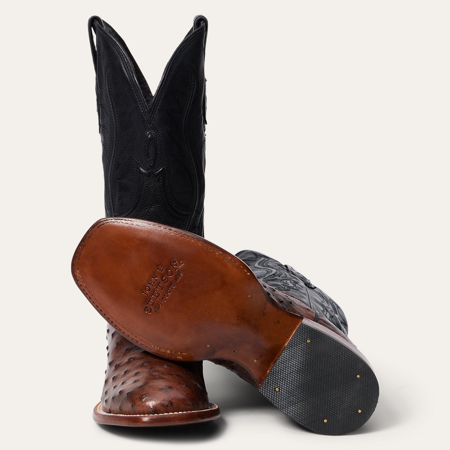 A square toe exotic boot that combines a working cowboy silhouette with luxury materials, the Ozzy Ostrich Boot features a full Ostrich vamp and 13” calf leather shaft with intricate hand stitching and cording. It has a square toe—a popular working style that provides maximum all-day comfort—and channel welted full leather construction with 56 lemonwood pegs and eight premium brass nails per boot. The beveled bottom sole is thinned out toward the edges, creating a rounded, tapered appearance around the arch. A hand-stacked leather heel, premium cow leather lining, and a leather-lined Poron insole ensure comfort in every step.