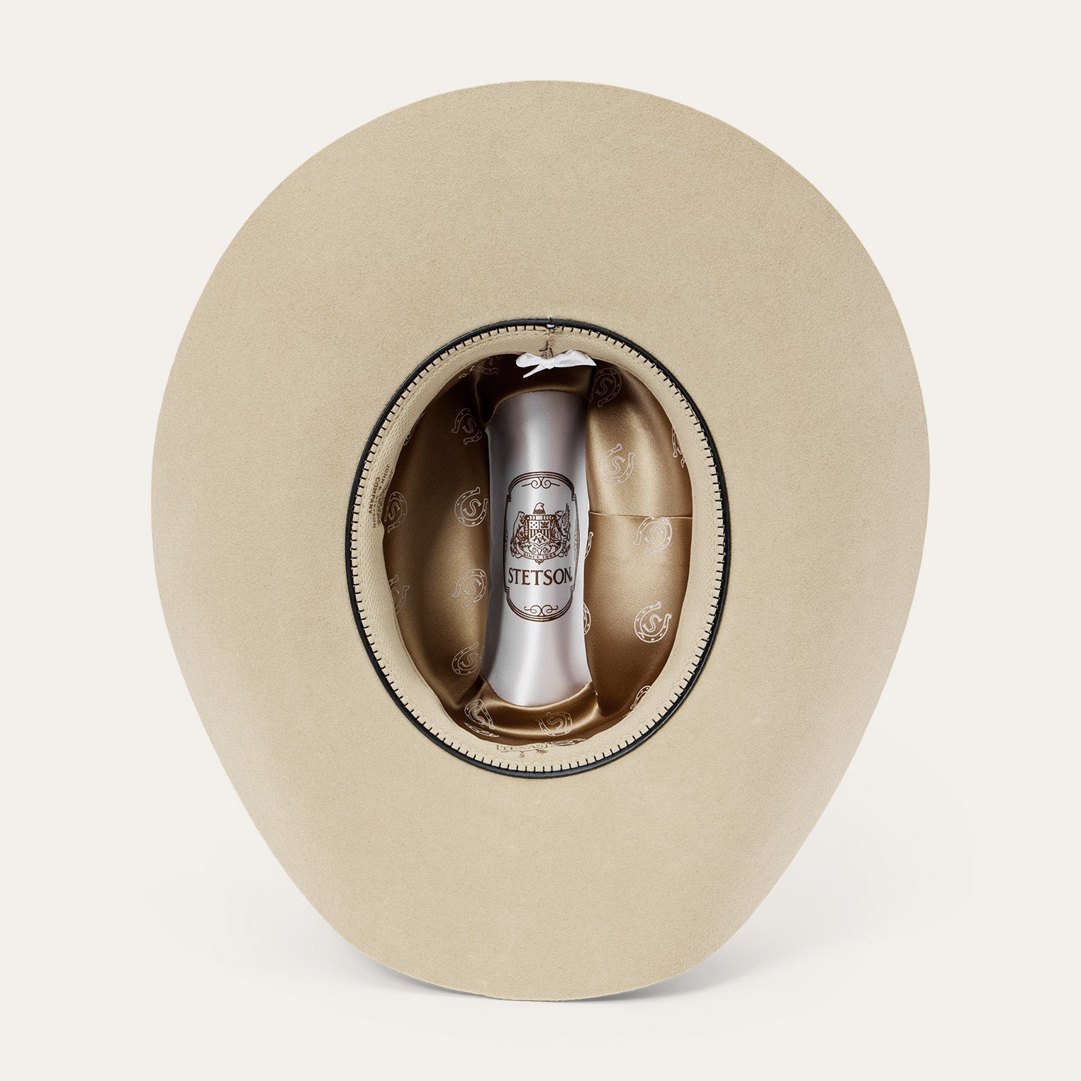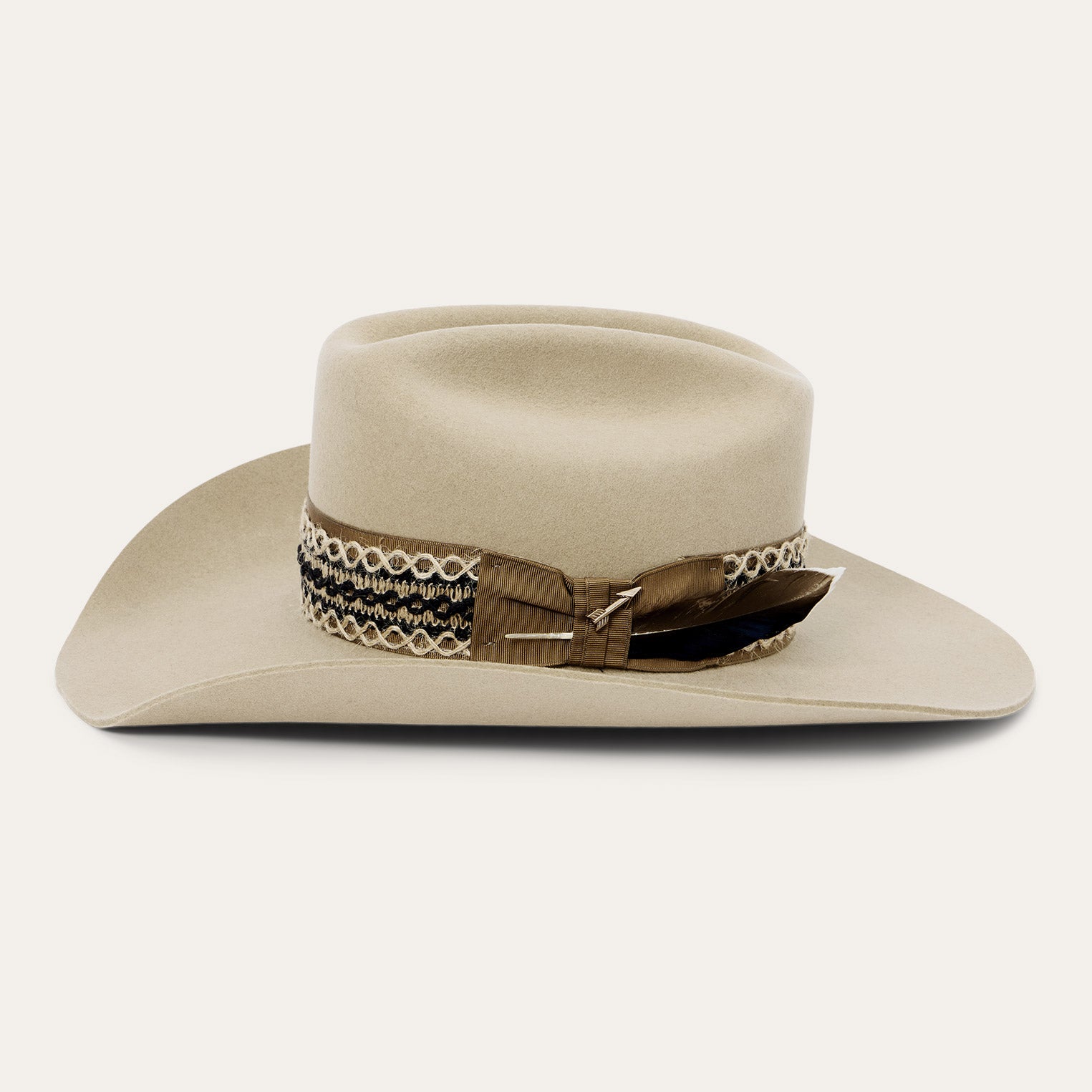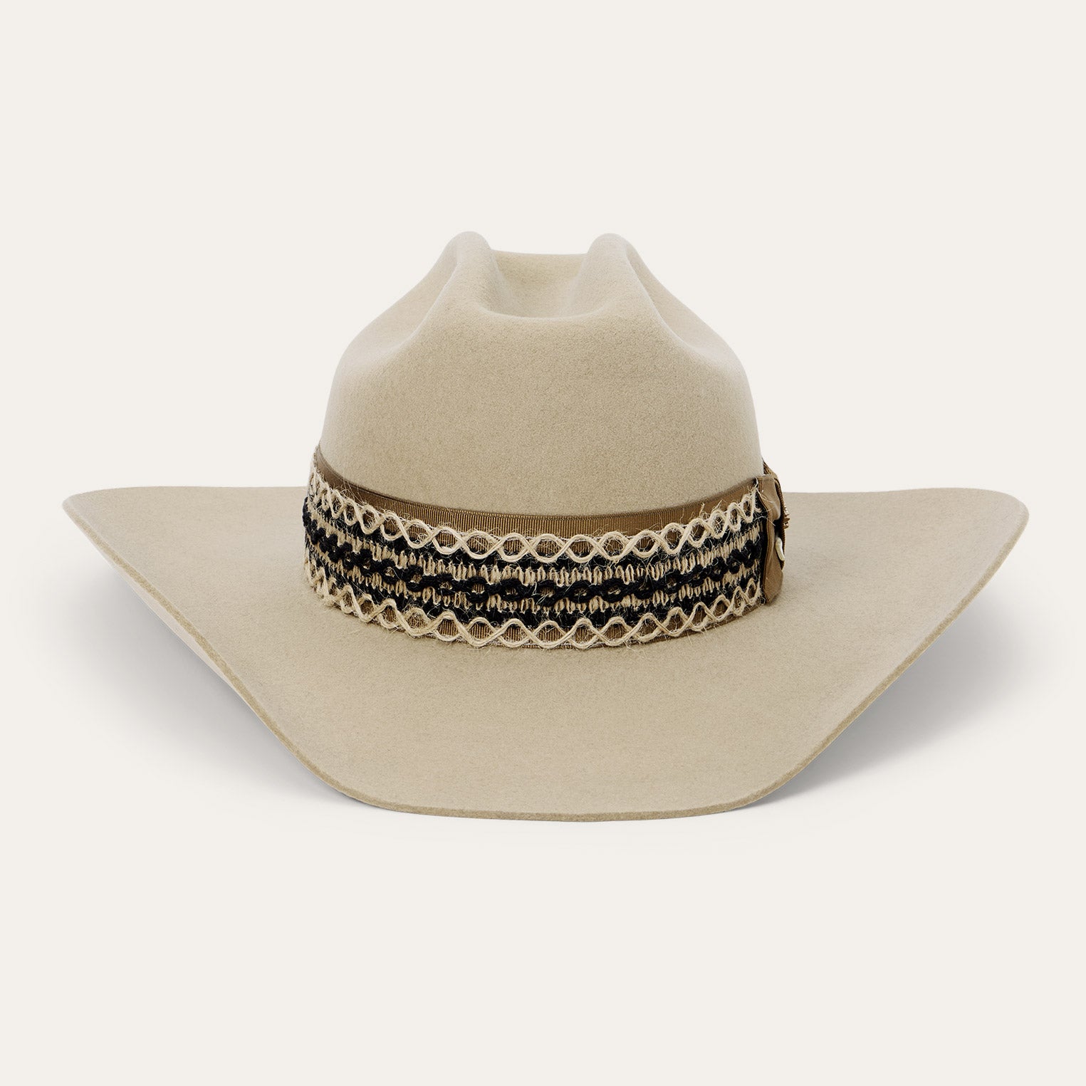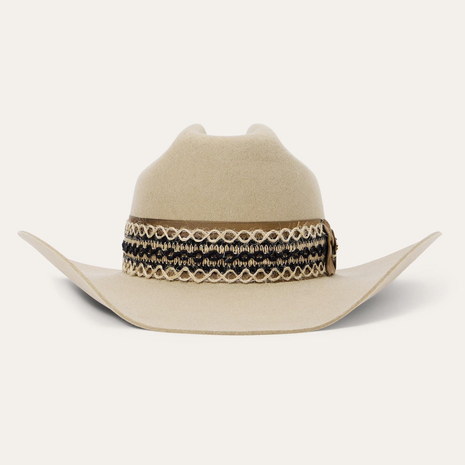 This western-inspired fashion hat makes a statement with its bold silhouette and unique, bohemian style details. It features a 4 3/8" medium cattleman crown, 3 3/4" brim, woven hatband and removable feather detail. Handmade in the U.S.A. from high-quality wool felt, it’s finished with a moisture-wicking DRI-LEX® sweatband and satin liner for a comfortable, all-day fit.