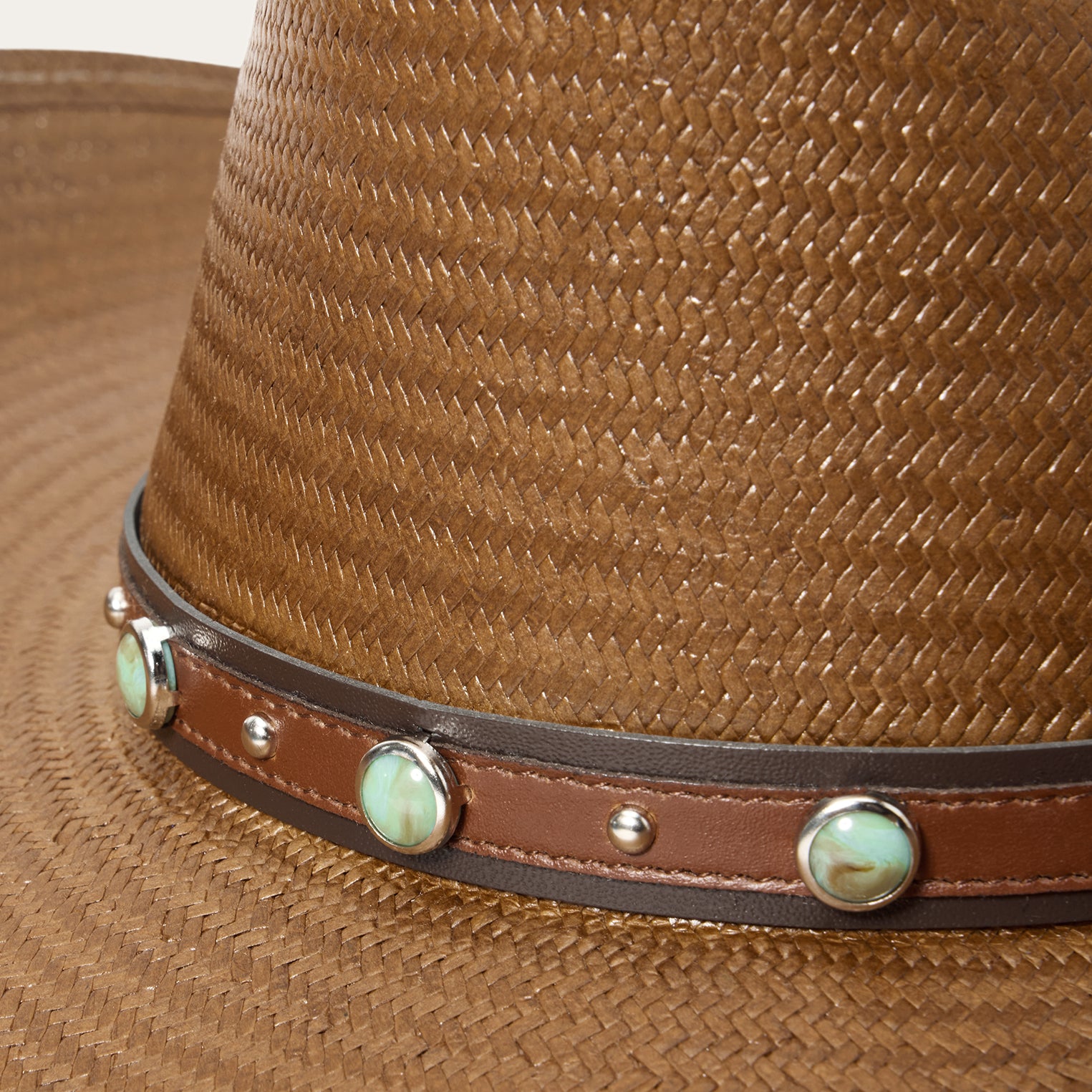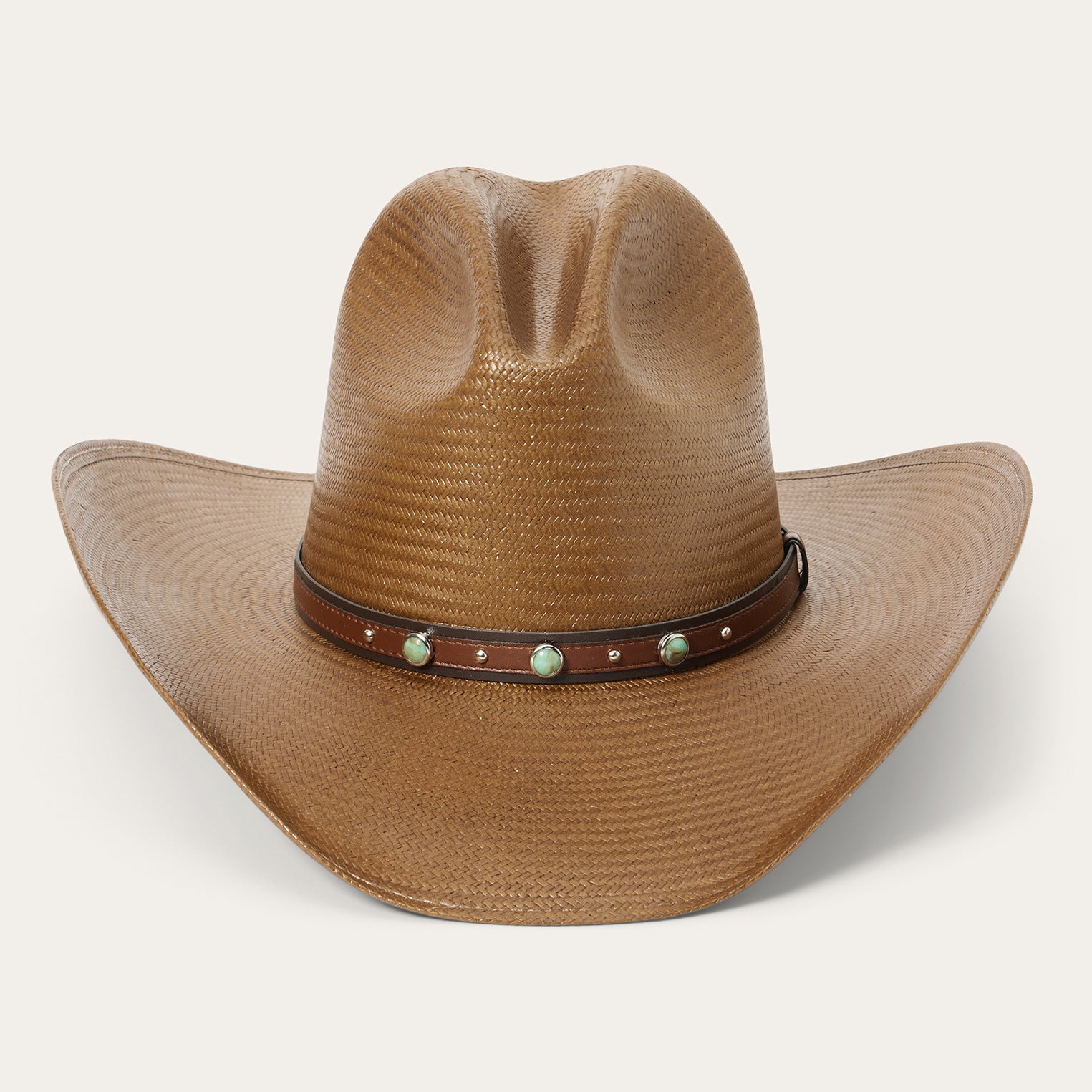 This western fashion hat combines a classic silhouette with statement-making details. Handmade in the U.S.A. from high-quality shantung straw, which is prized for its durability and smooth, lightweight feel, it features a 4 x 5 1/8” tall slope pinch front crown, a 4” medium curved brim, and a striking two-tone leather hatband with turquoise and silver-tone studs. An absorbent DRI-LEX® sweatband provides a cool, comfortable, all-day fit.