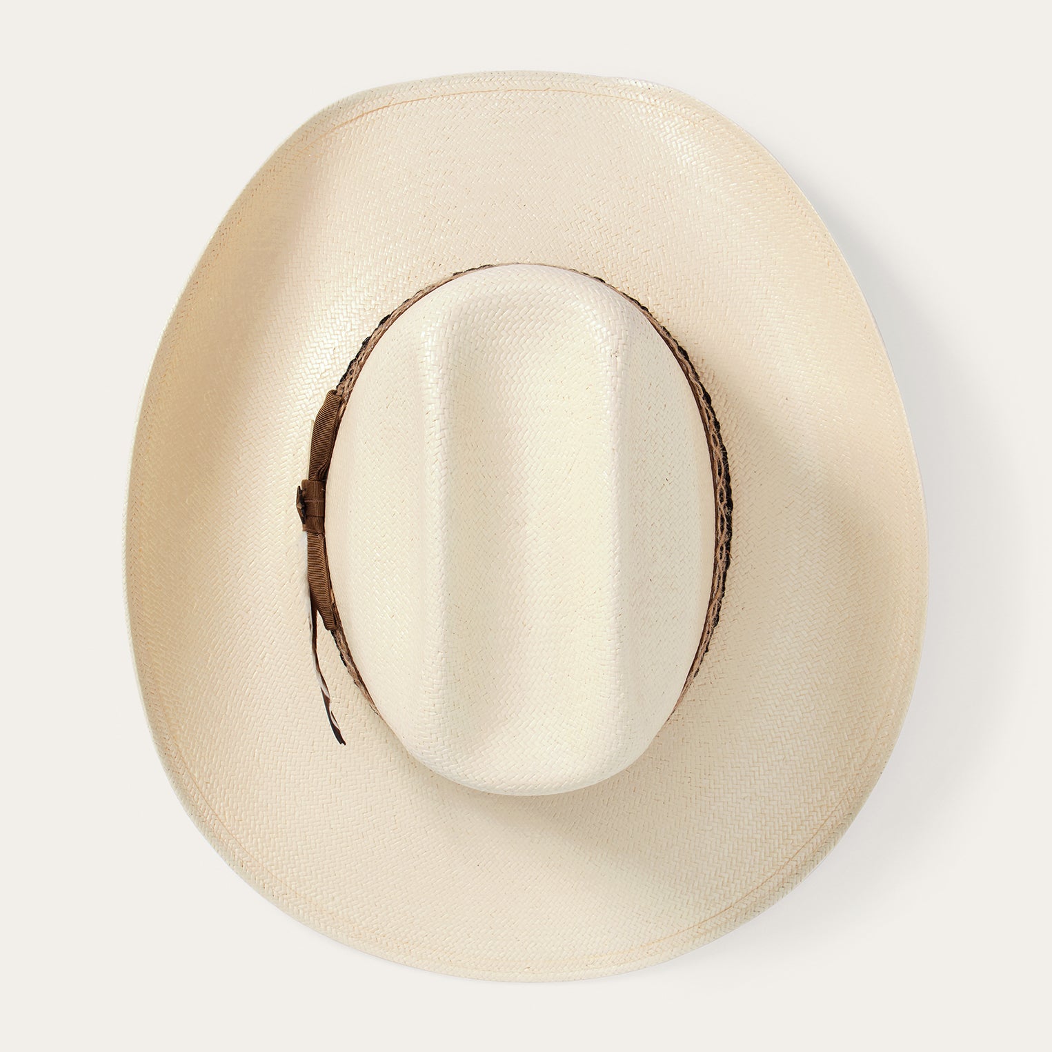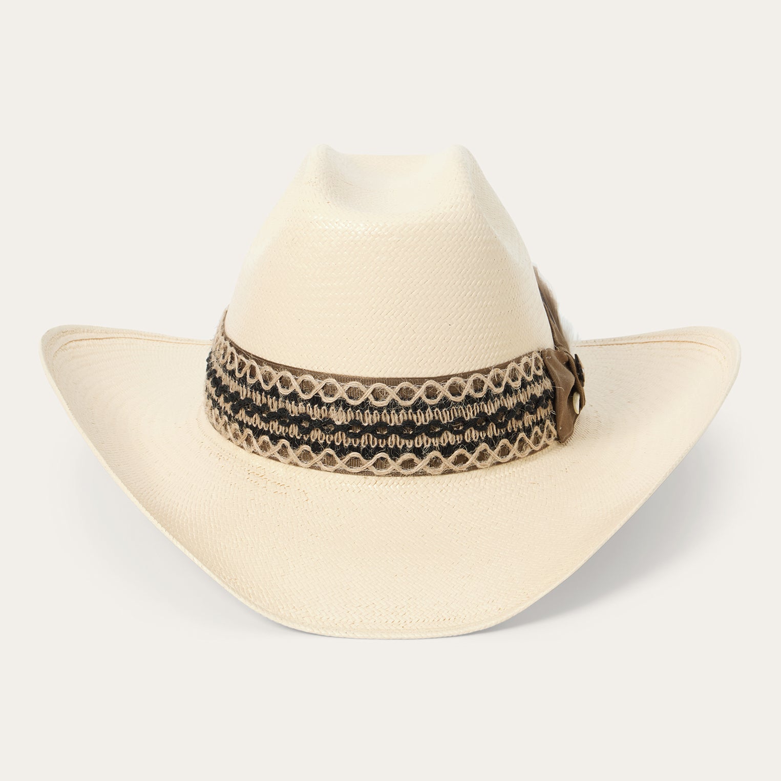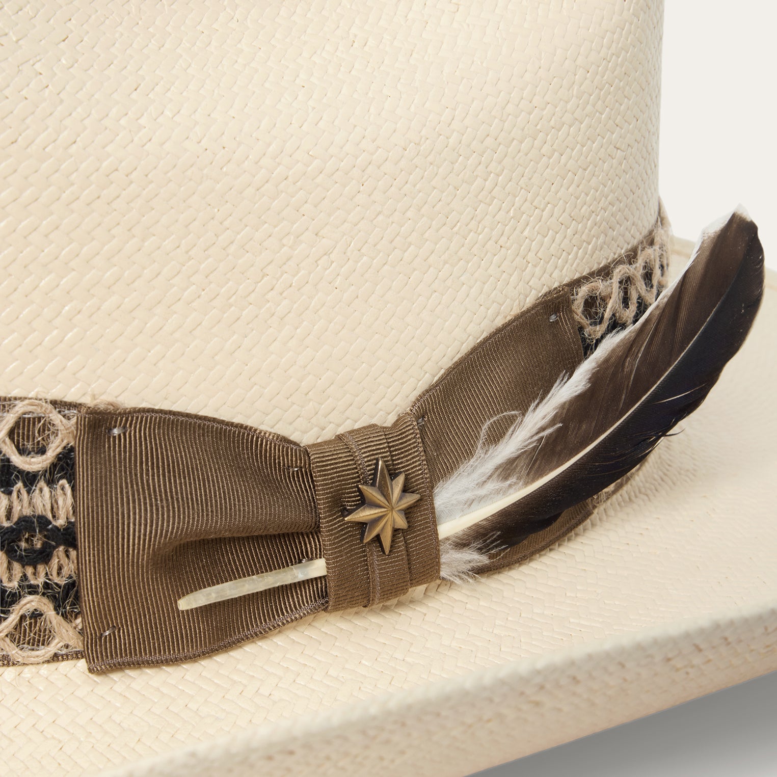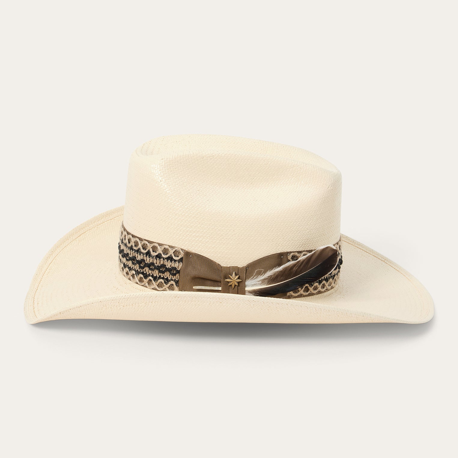 This straw hat combines a classic western silhouette with statement-making details. Handmade in the U.S.A. from high-quality shantung straw, which is prized for its durability and smooth, lightweight feel, it features a 4 1/2” tall cattleman crown, a 3 3/4” slightly curved brim, and a grosgrain hatband with a colorful woven overlay, side bow, star pin and removable feather detail. An absorbent DRI-LEX® sweatband provides a cool, comfortable, all-day fit.