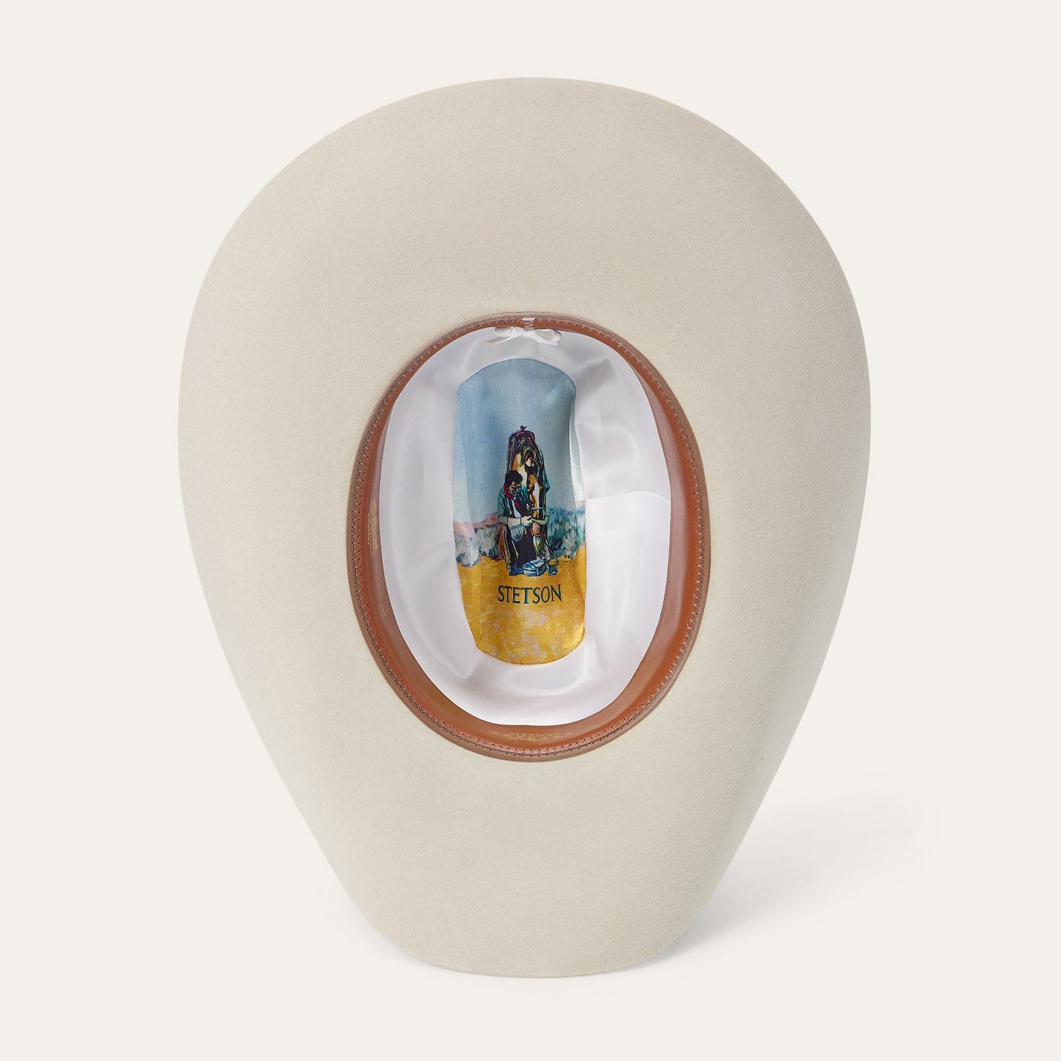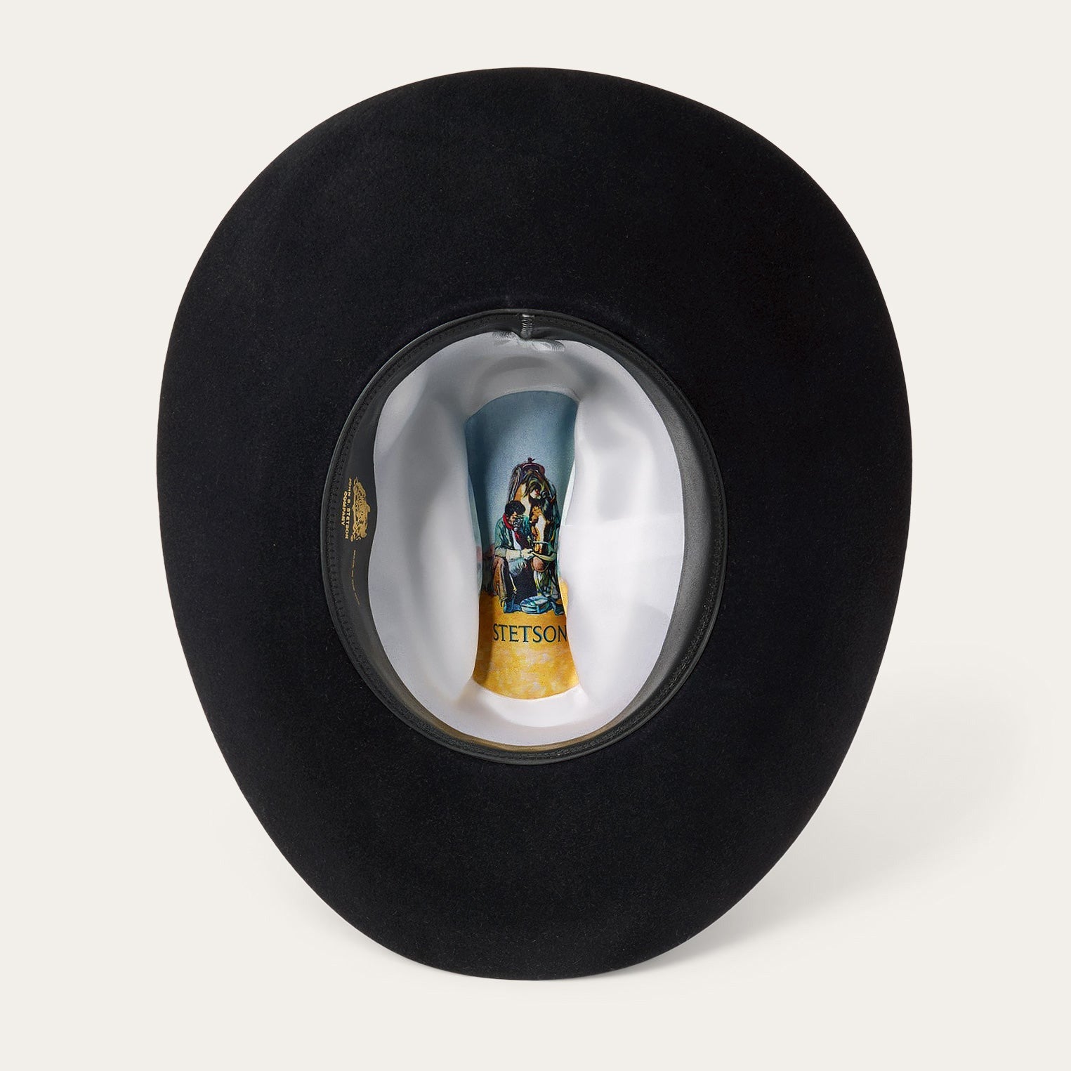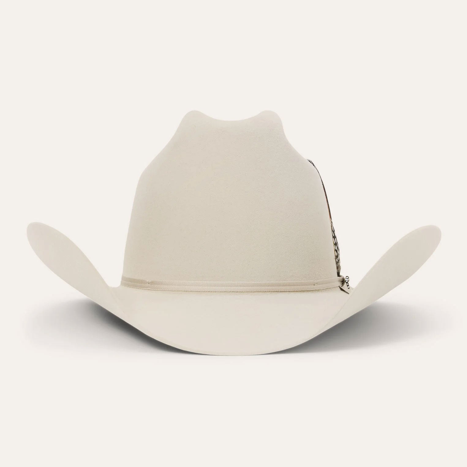 The classic Rancher remains one of our most enduringly popular western hats, famed for its iconic, retro-style profile. A favorite of working cowboys, country music stars, and wildcatting oilmen alike, it features a tall 5” cattleman crown and 4” heavy curved brim, complemented by a 2-ply cord hat band, removable feather detail and JBS branding iron pin—a nod to our trailblazing founder John B. Stetson. It’s crafted from our proprietary 6X quality fur felt blend, giving it a substantial feel designed to hold its shape come rain or shine, and, as with all hats that come out of our factory in Texas, each Rancher is touched by more than 100 sets of hands during production, resulting in a hat that is designed and built to stand the test of time. A handsewn genuine leather sweatband and full satin liner provide a time-tested fit and premium comfort.