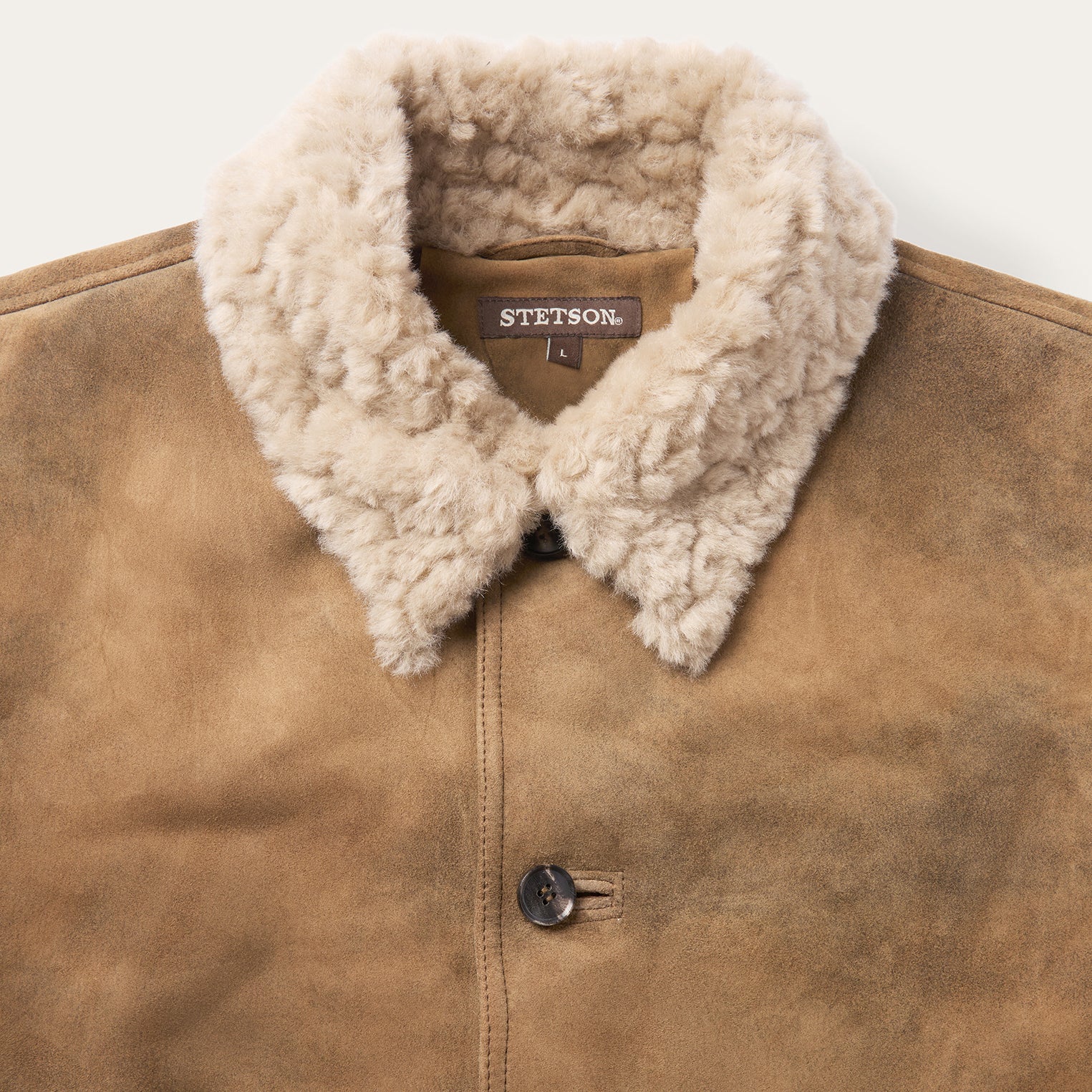 Crafted from richly textured suede and fully lined with warm sherpa, the Antique Suede Shearling Jacket is a cold-weather essential with a timeless western silhouette. It features a full button front, a classic sherpa collar, and angled welt hand pockets at the hips. Designed for comfort and ease of wear, it includes nylon-lined sleeves for smooth layering and detailed seaming at the waist and sides for a structured fit.