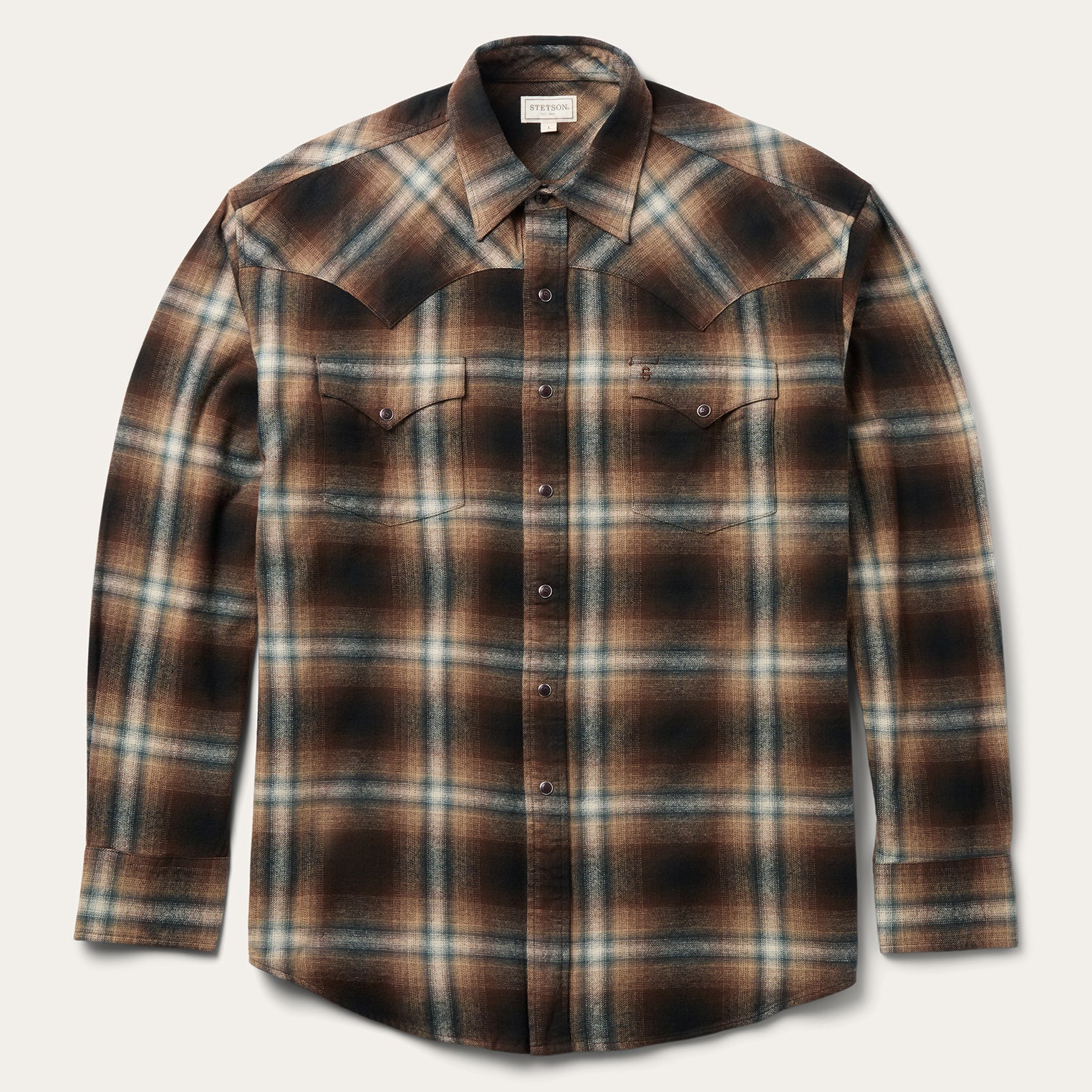 Crafted from high-quality yarn-dyed cotton with subtle dobby stitching, the Ombre Plaid Western Shirt offers a richly textured take on a classic. It features an ultra deep one-point curved back yoke, opaque logo snaps, and contrast trim fabrics throughout the interior for a touch of unexpected detail. Stetson embroidery at the chest and sleeve placket complete the look. Cut in our Classic Fit, a traditional working cowboy style that offers full freedom of movement and a longer hem that’s designed to stay tucked-in while riding.