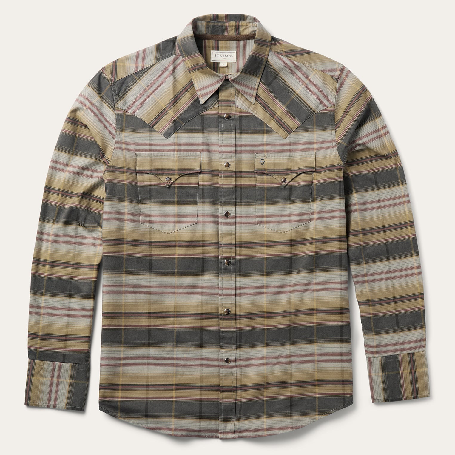 The Serape Plaid Western Shirt is crafted from high-quality, 100% cotton twill and garment washed for a soft, broken-in feel. Featuring our exclusive serape-inspired plaid, it’s detailed with one-point curved yokes, a spread collar with collar stays, and a classic snap front with opaque logo snaps. Finished with three-snap cuffs and signature logo embroidery, it’s cut in our Tailored Fit—a versatile style that’s slightly tapered at the sides for a streamlined appearance and a shorter length designed to look great tucked or untucked.