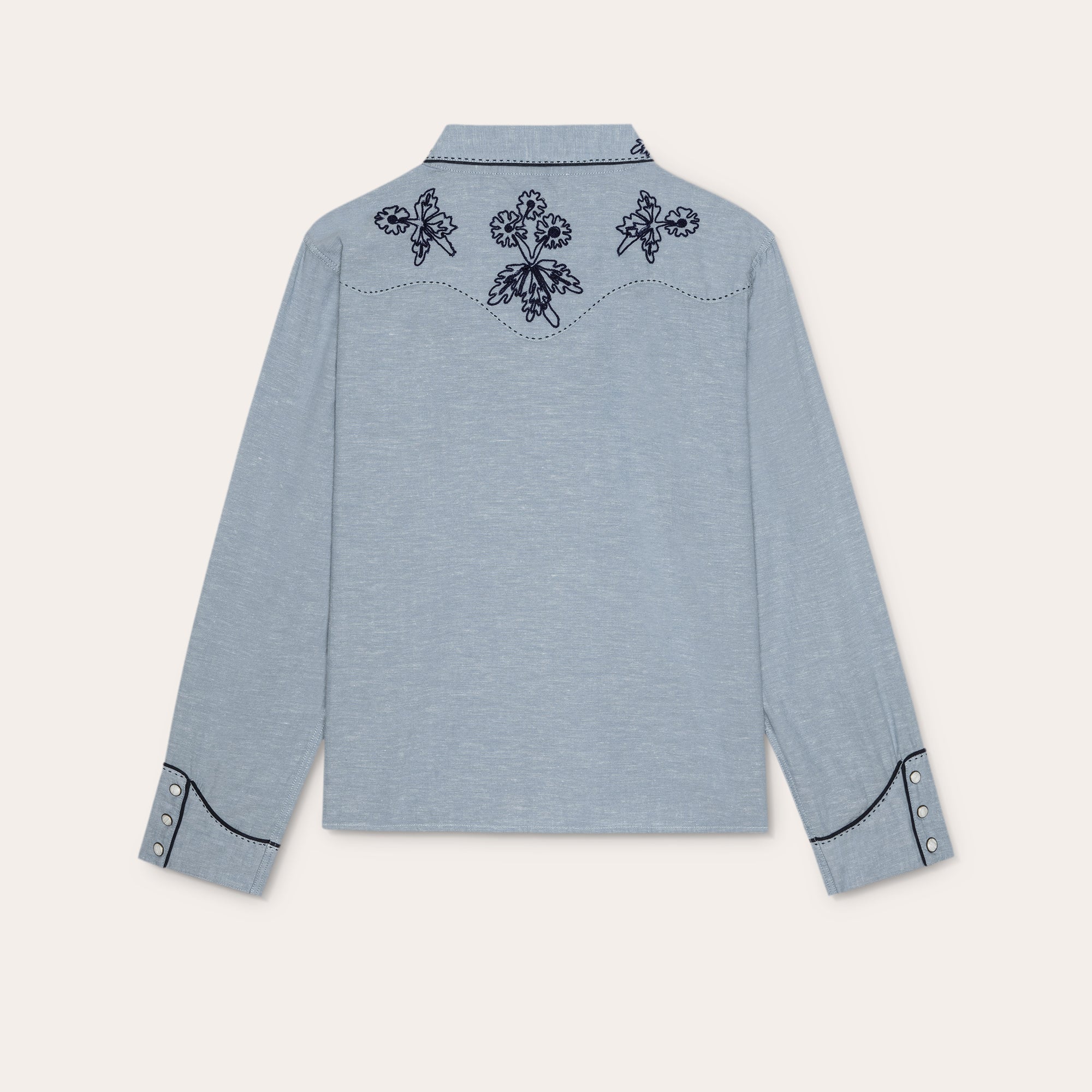 Created in collaboration with THE GREAT., the Chambray Embroidered Western Shirt channels the charm of a treasured 1940s rodeo find. Cut from lightweight chambray with a soft denim feel, the shirt is detailed with dark navy Western floral embroidery and piped finishes that frame the silhouette. Classic Western chest pockets add a nostalgic, heritage-inspired touch. The fit is boxy and relaxed, balanced by tailored elements like a crisp shirt collar and traditional Western sleeve cuffs that bring structure to the easy shape. Style it tucked into the matching Western Embroidered Highland Skirt for a coordinated look.