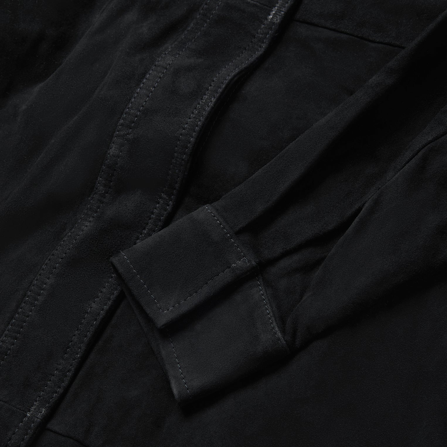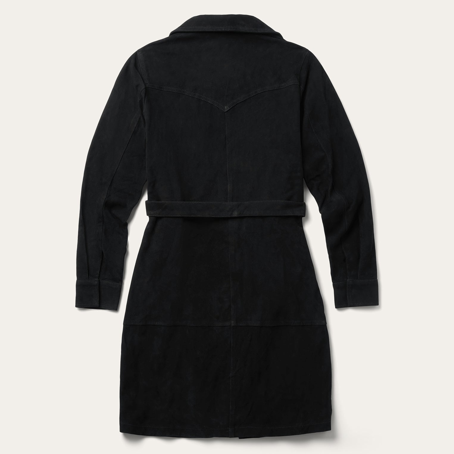 The Suede Western Shirt Dress is crafted from supple suede that brings a refined edge to a classic western silhouette. It features an oversized notch collar, a full snap front with a hidden placket, and a deep single-point back yoke. Patch pockets with flaps add functional detail, while a self-tie belt flatters the waist. Finished with single-snap cuffs, it’s a statement-making piece with timeless western character.