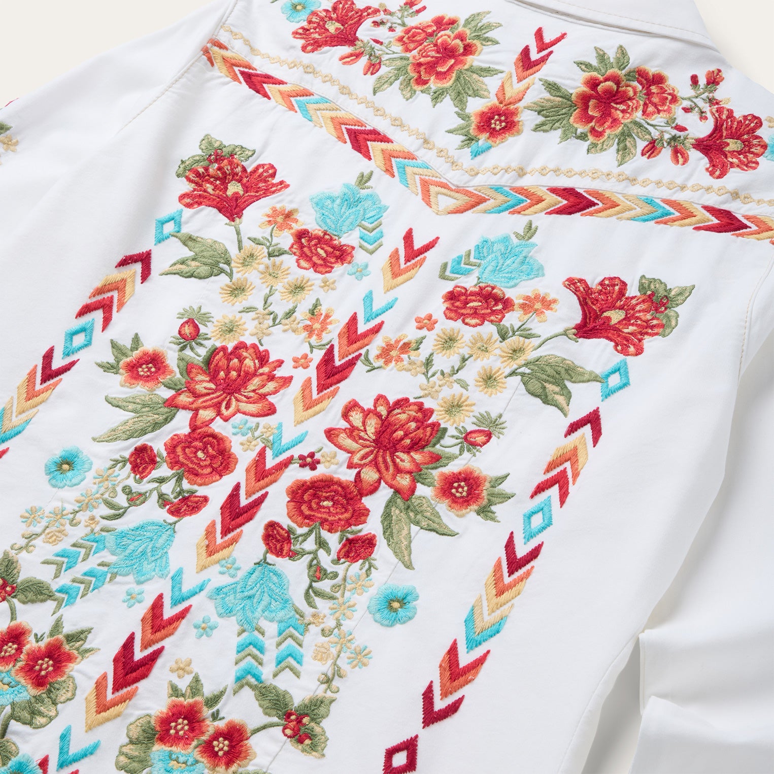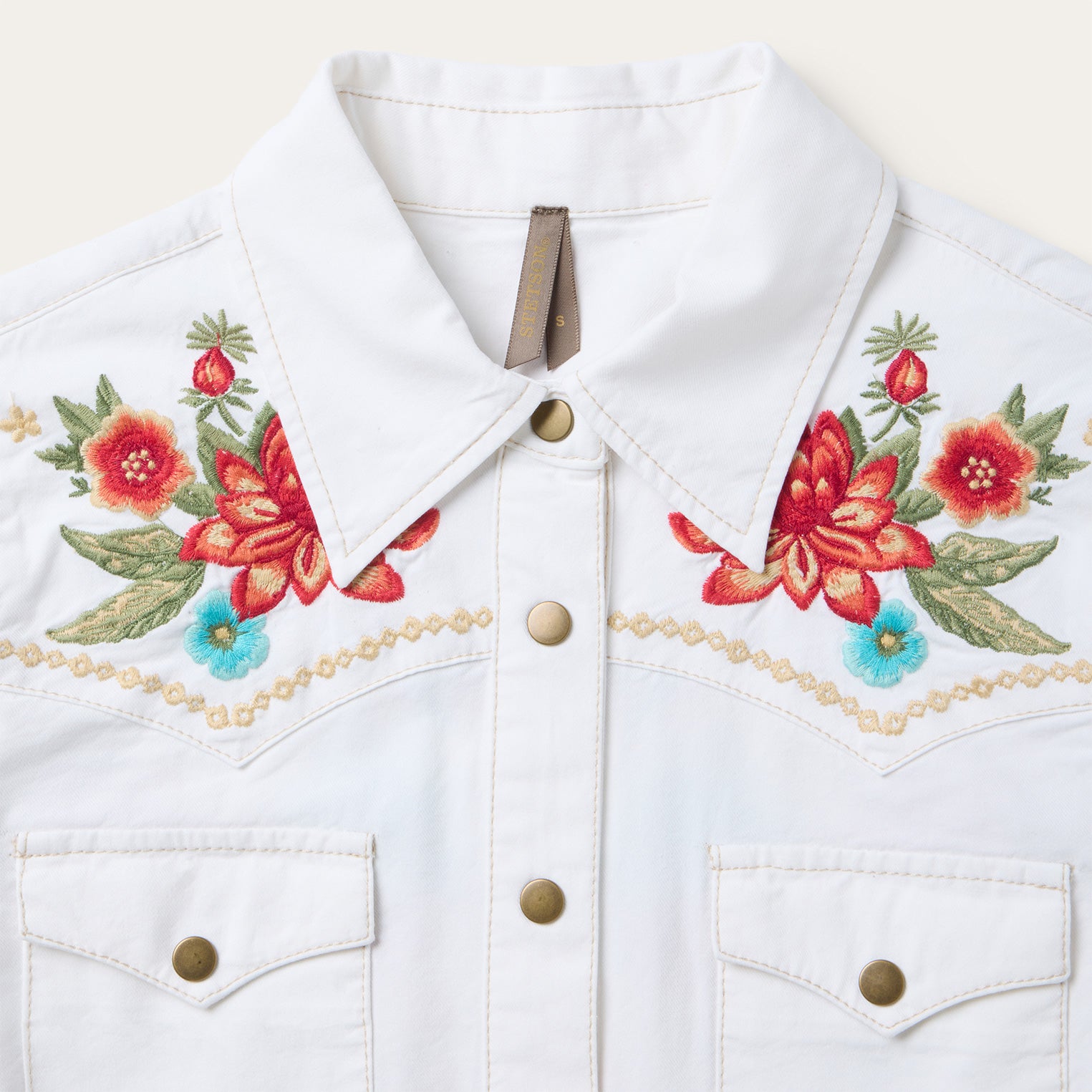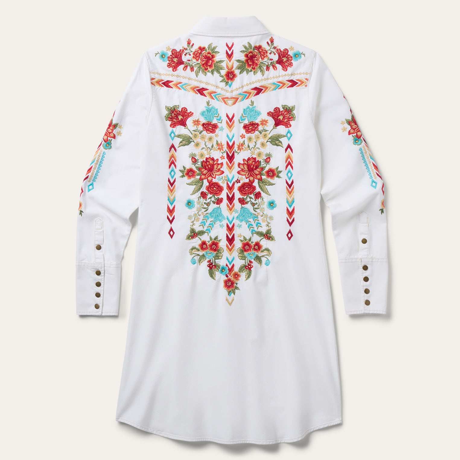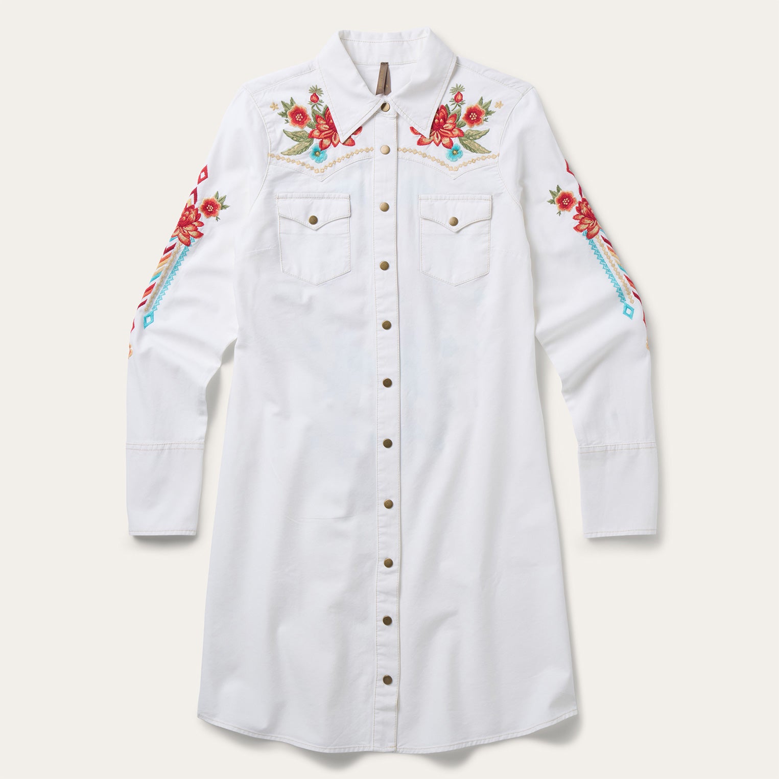 This denim western dress is crafted from a soft, lightweight cotton-blend that’s been garment washed for extra softness and features an intricate floral embroidery on its front yoke, sleeves and back. It has single point front and back yokes, single point pockets and five-snap cuffs.
