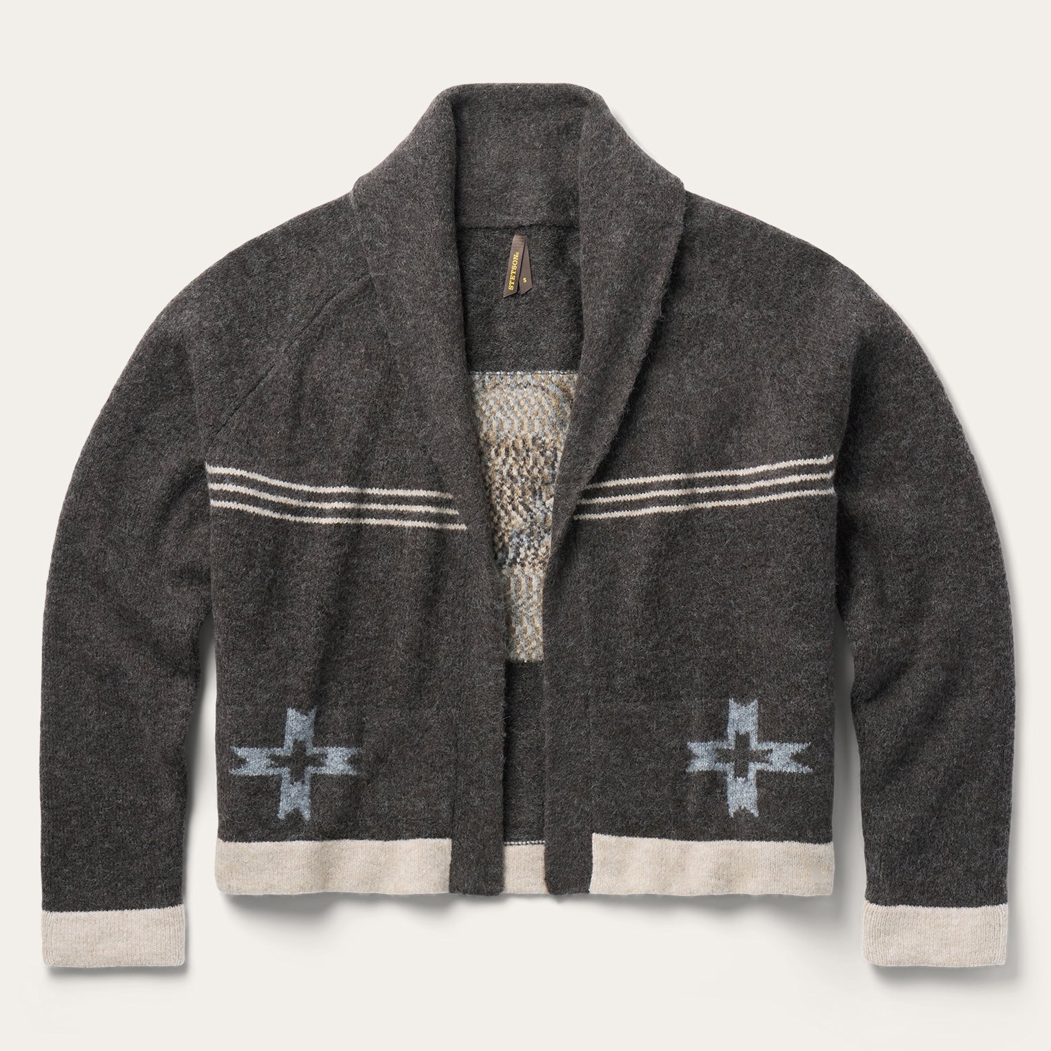 The Rodeo Girl Cropped Cardigan is knit from a soft, stretchy wool blend and features a bold retro-style cowgirl motif on the back. It has a classic shawl collar and contrast solid cream trim at the waist and sleeves. Like all of our women’s apparel, it’s thoughtfully designed and crafted for lasting comfort, quality, and style—from sunup to sundown.