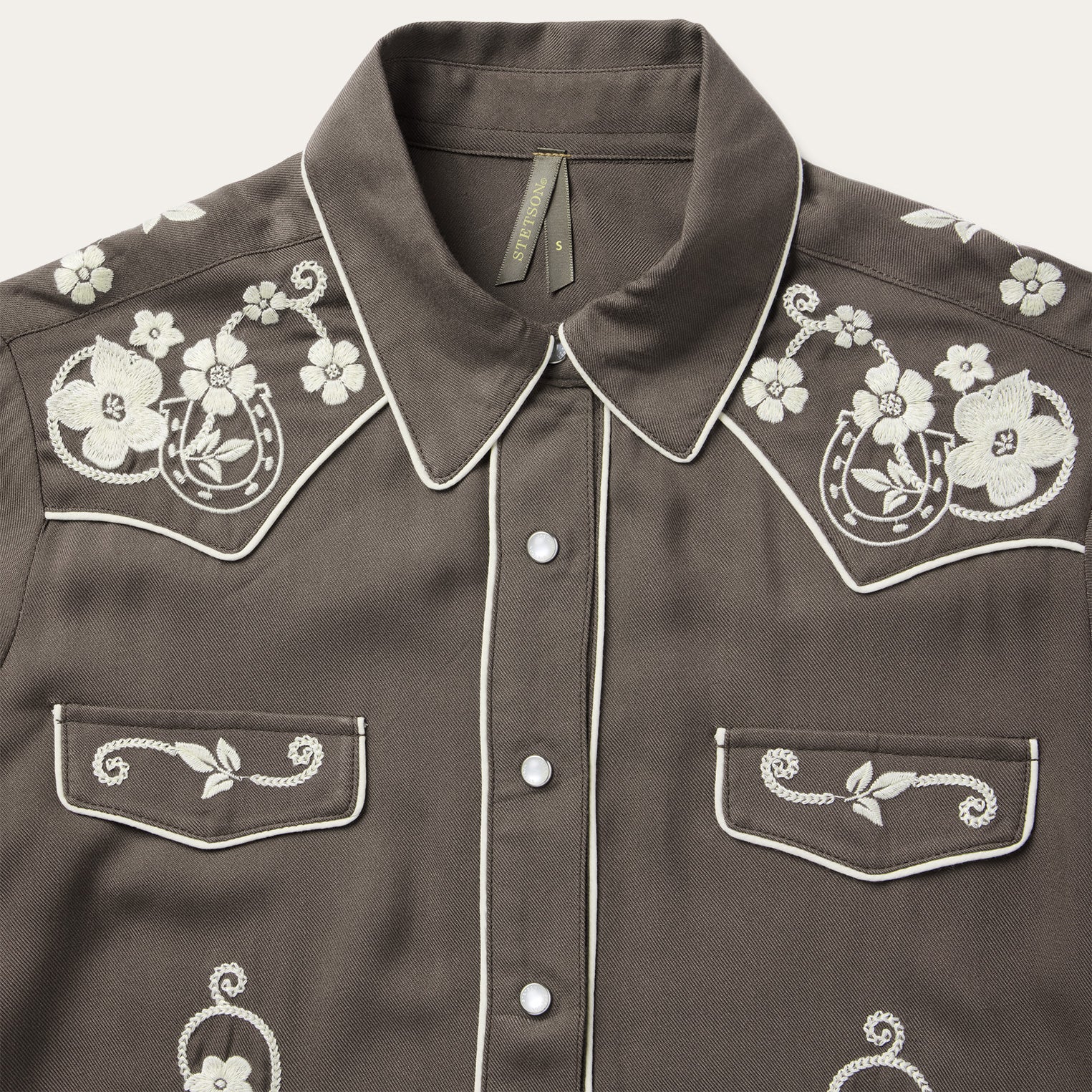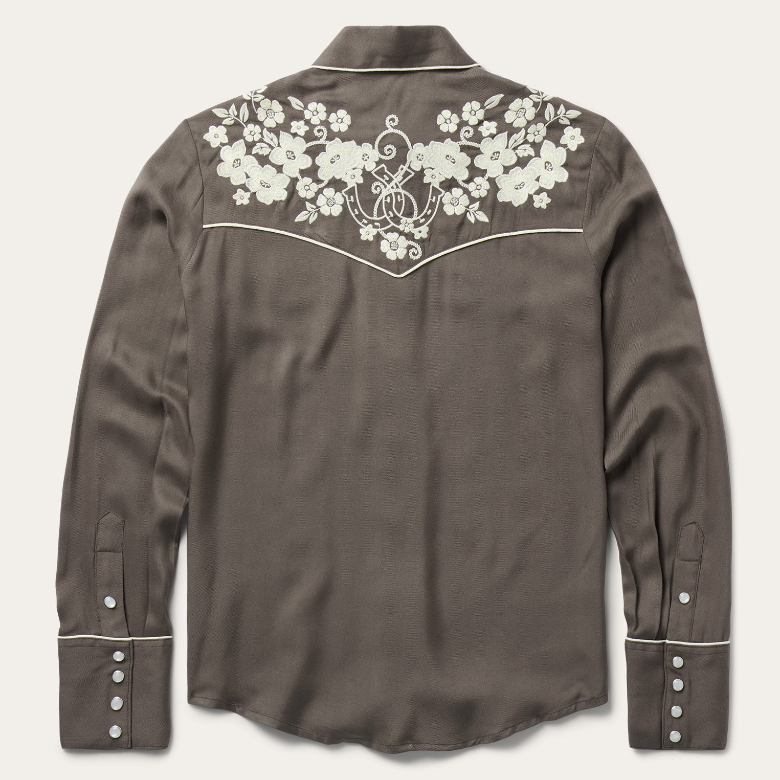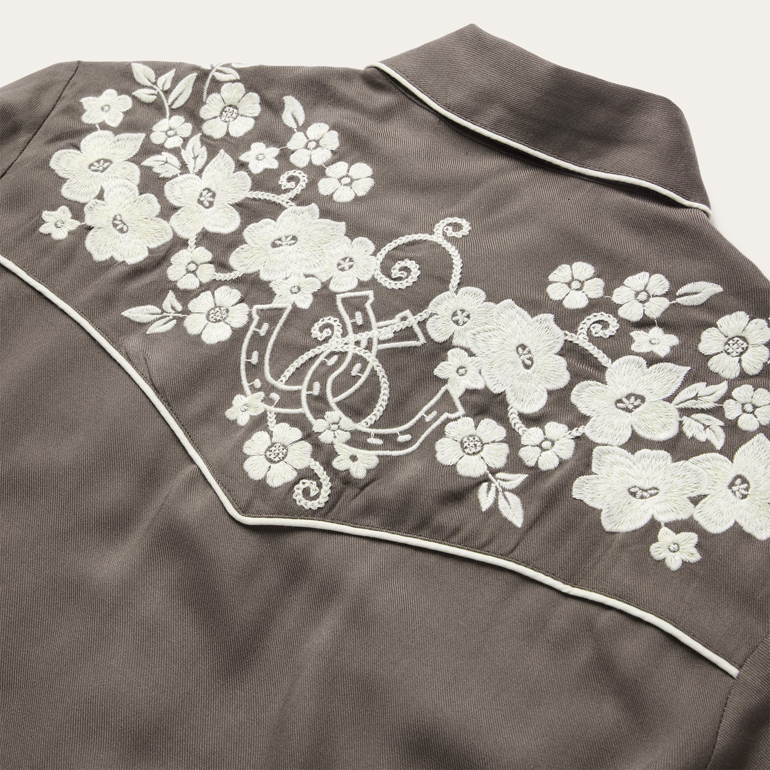 Inspired by vintage western wear, the Embroidered Retro Western Blouse is crafted from soft 100% rayon with a fluid drape and distinctive character. It features classic single-point curved front and back yokes, faux pocket flaps, and retro cream piping. Intricate western-style embroidery adds a touch of flair, while the relaxed Boyfriend Fit provides a comfortable, flattering silhouette.