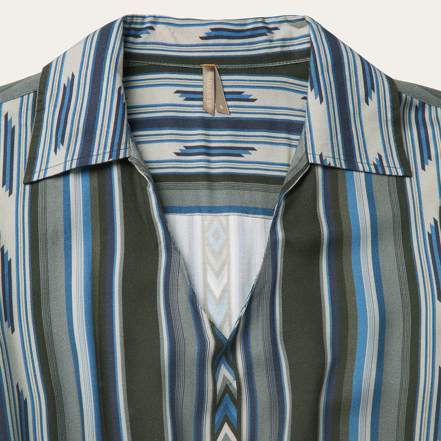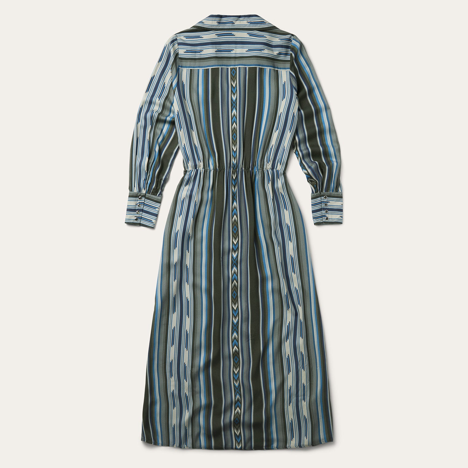 This ankle-length western-style dress is crafted from soft, drapey 100% viscose twill in our exclusive Olive Serape print. It has a fold-down collar with a flattering V-neckline, a straight back yoke, and an elastic waist for an easy, comfortable, flattering fit. The full skirt is partially lined for added structure and features deep four-snap cuffs and two side pockets.