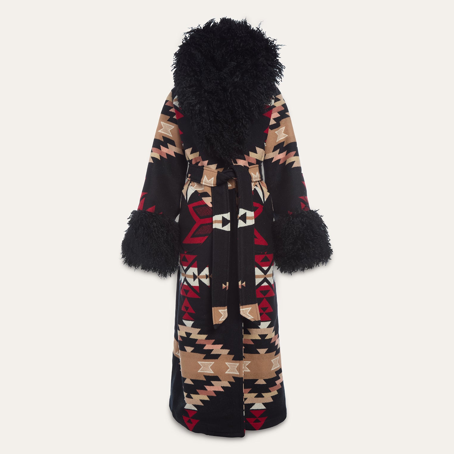 This luxurious full-length unlined duster is crafted from unnapped Pendleton blankets, and is cut and sewn in Lindsey Thornburg’s New York City atelier. It features shaggy Mongolian sheep shearling fur cuffs and fur lined hood, raglan sleeves lined with silk rayon peachskin, waist tie belt with loops, patch pockets and wool cashmere facings.