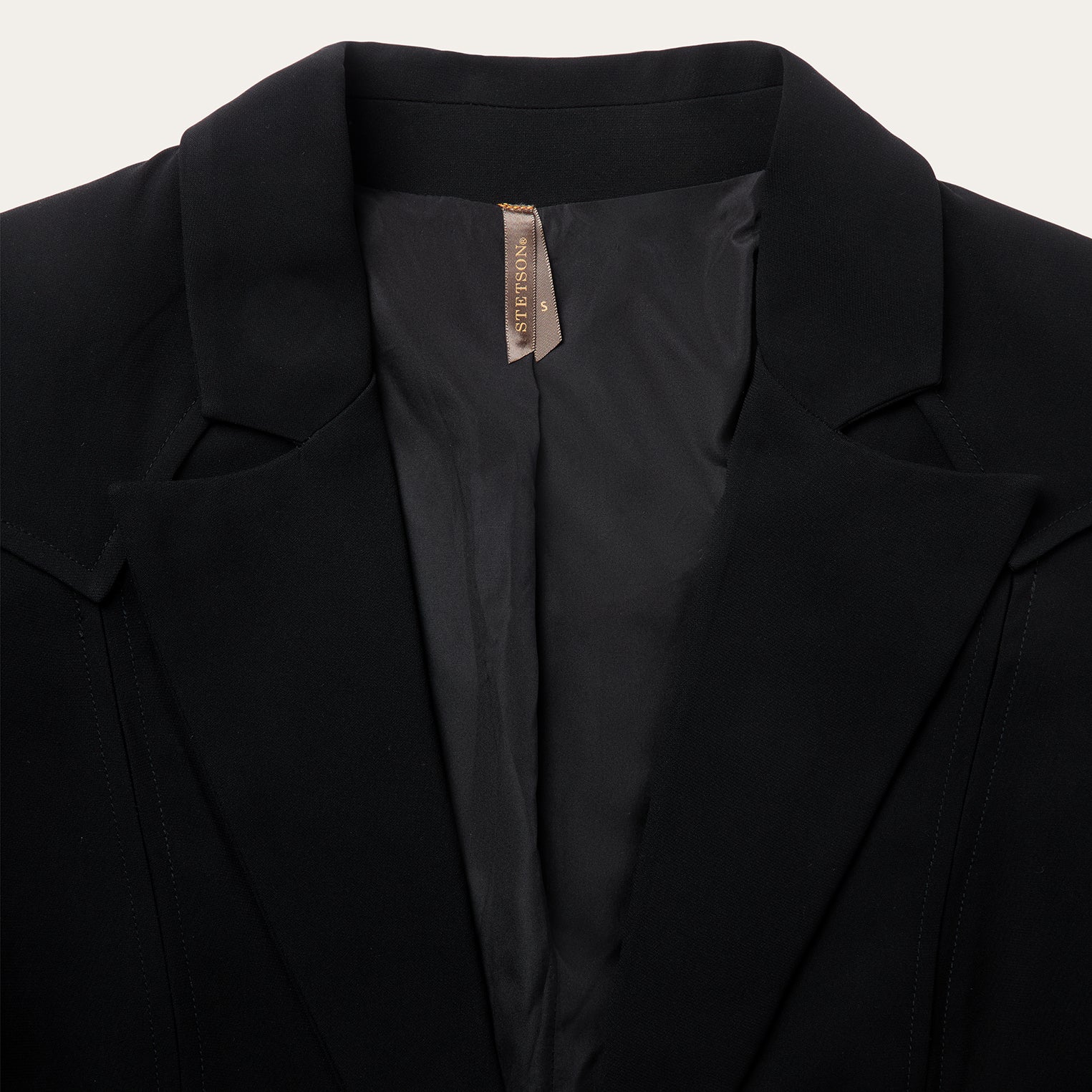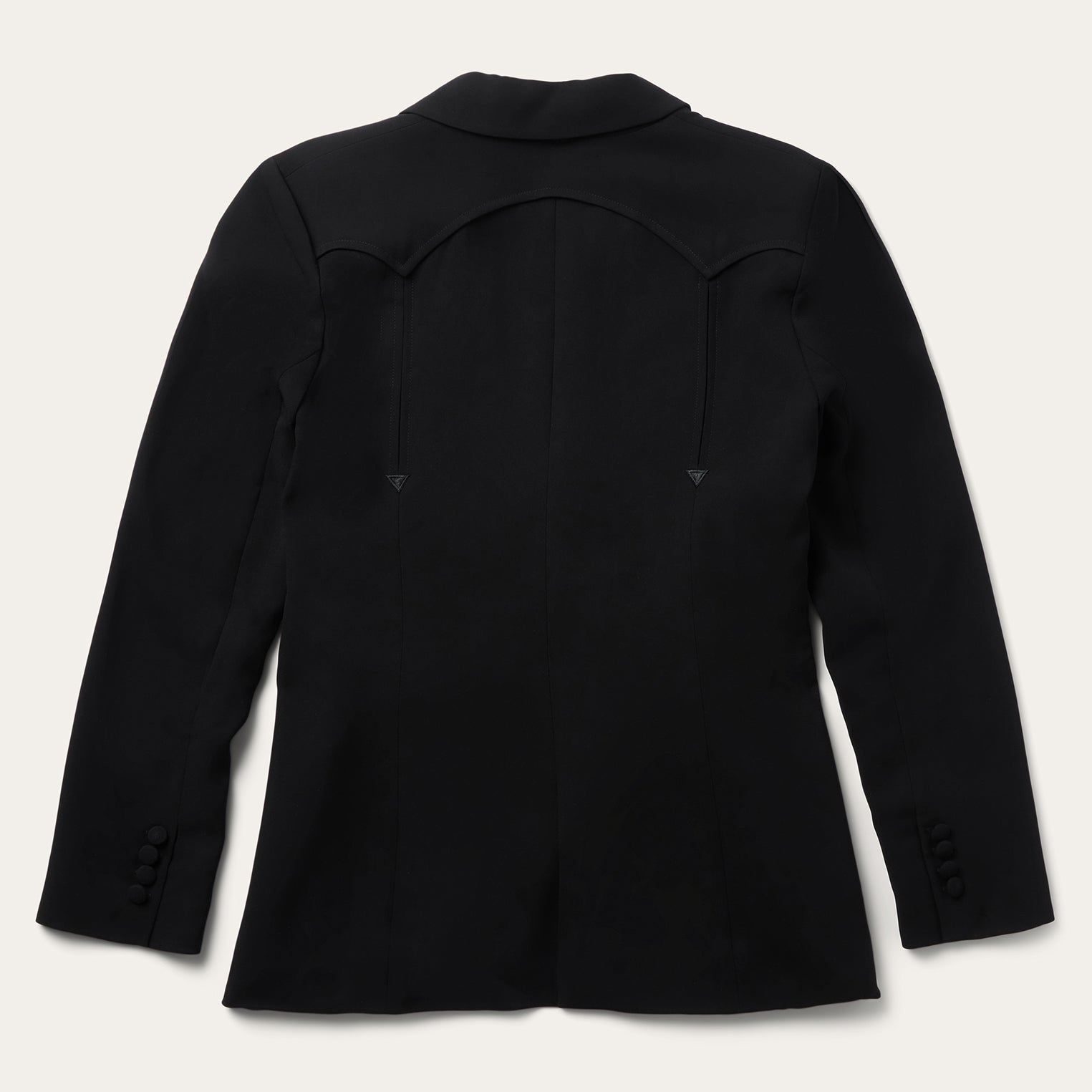 Timeless and refined, the Western Blazer is crafted from a smooth, high-quality crepe blend that offers a soft handfeel and elegant drape. It features distinctive western tailoring, with a single-point curved front yoke, double-point curved back yoke, and arrow-point detailing at the princess seams. Designed with a notch collar, single-button closure, and a center back vent, it’s finished with welt and flap pockets, buttoned cuffs, and shaping darts for a flattering silhouette that moves with ease from day to evening.
