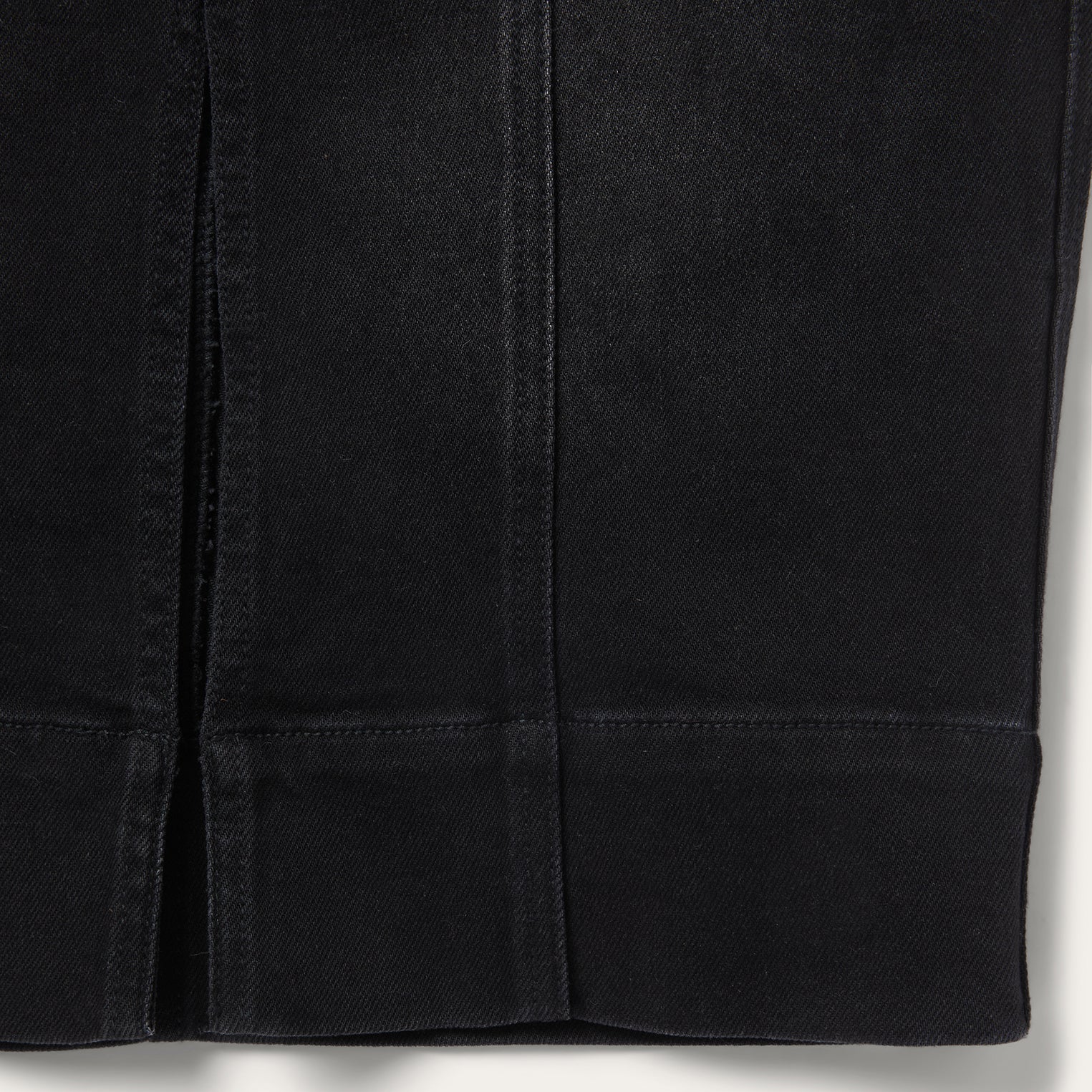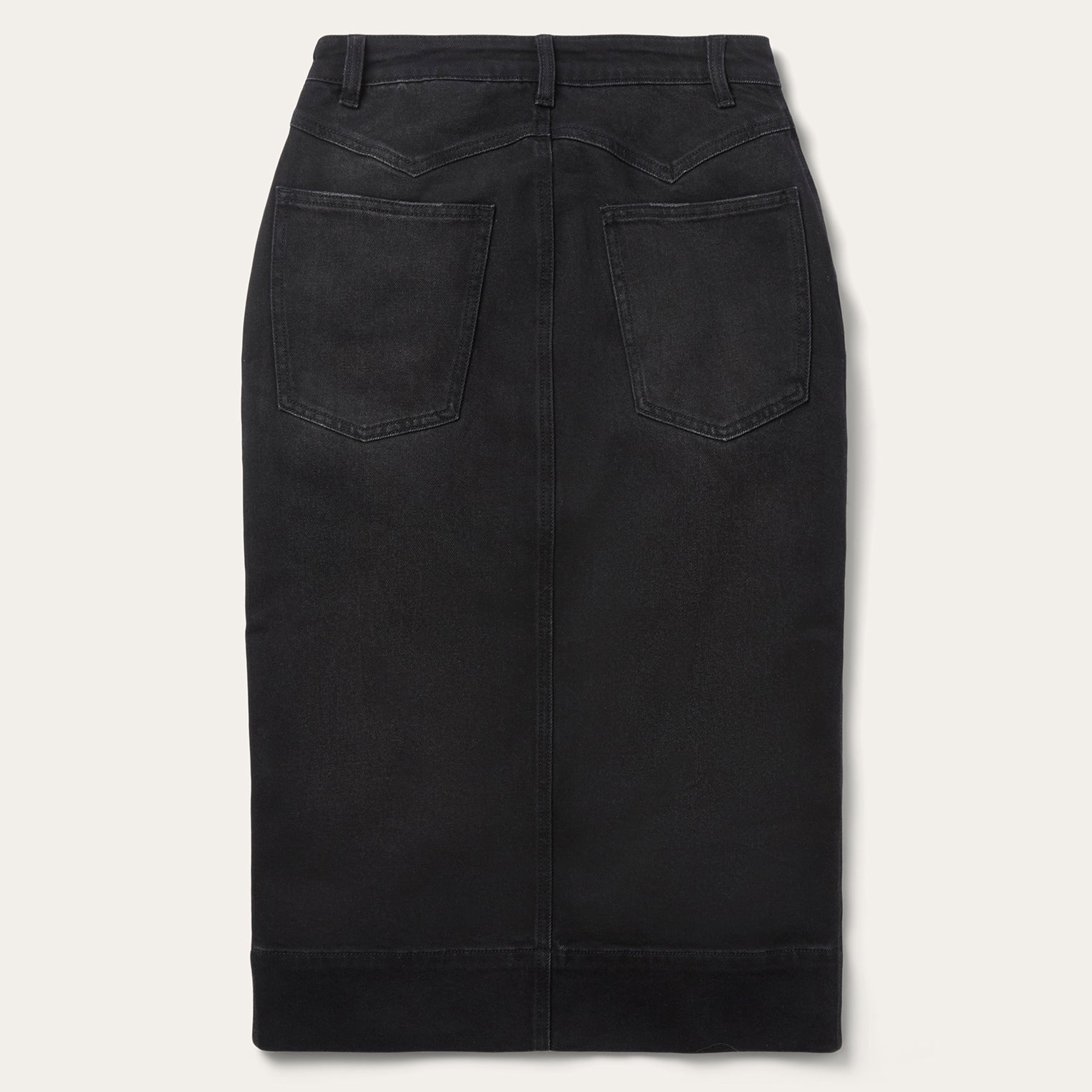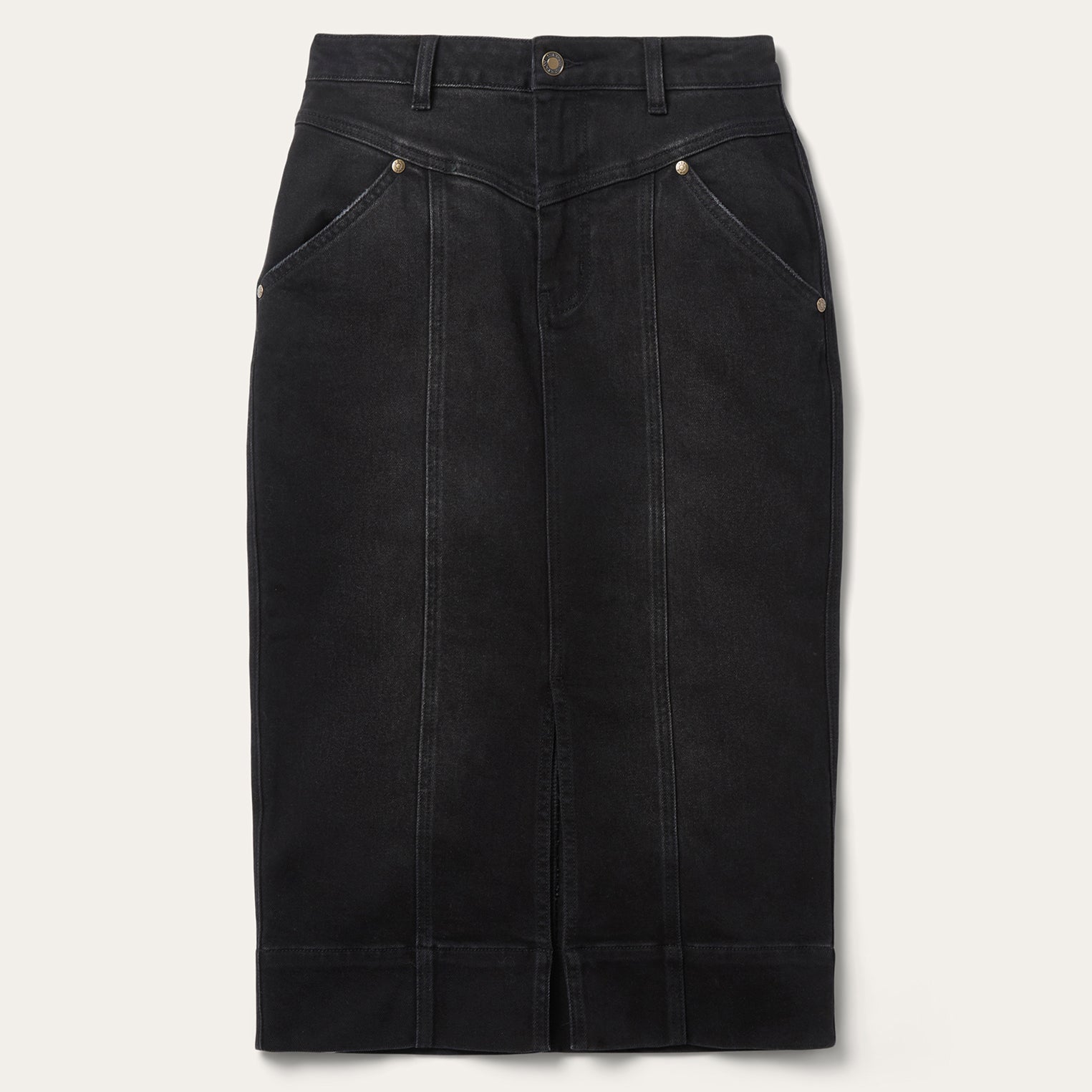 Crafted from soft black stretch denim with a flattering drape, the Denim Maxi Skirt offers a bold, western-inspired silhouette with elevated styling. It features a wide finished hem and a front slit for ease of movement, along with a single-point yoke at the front waist and a two-point curved yoke at the back for subtle shaping. Angled front hand pockets and single-point back patch pockets add functionality and detail.