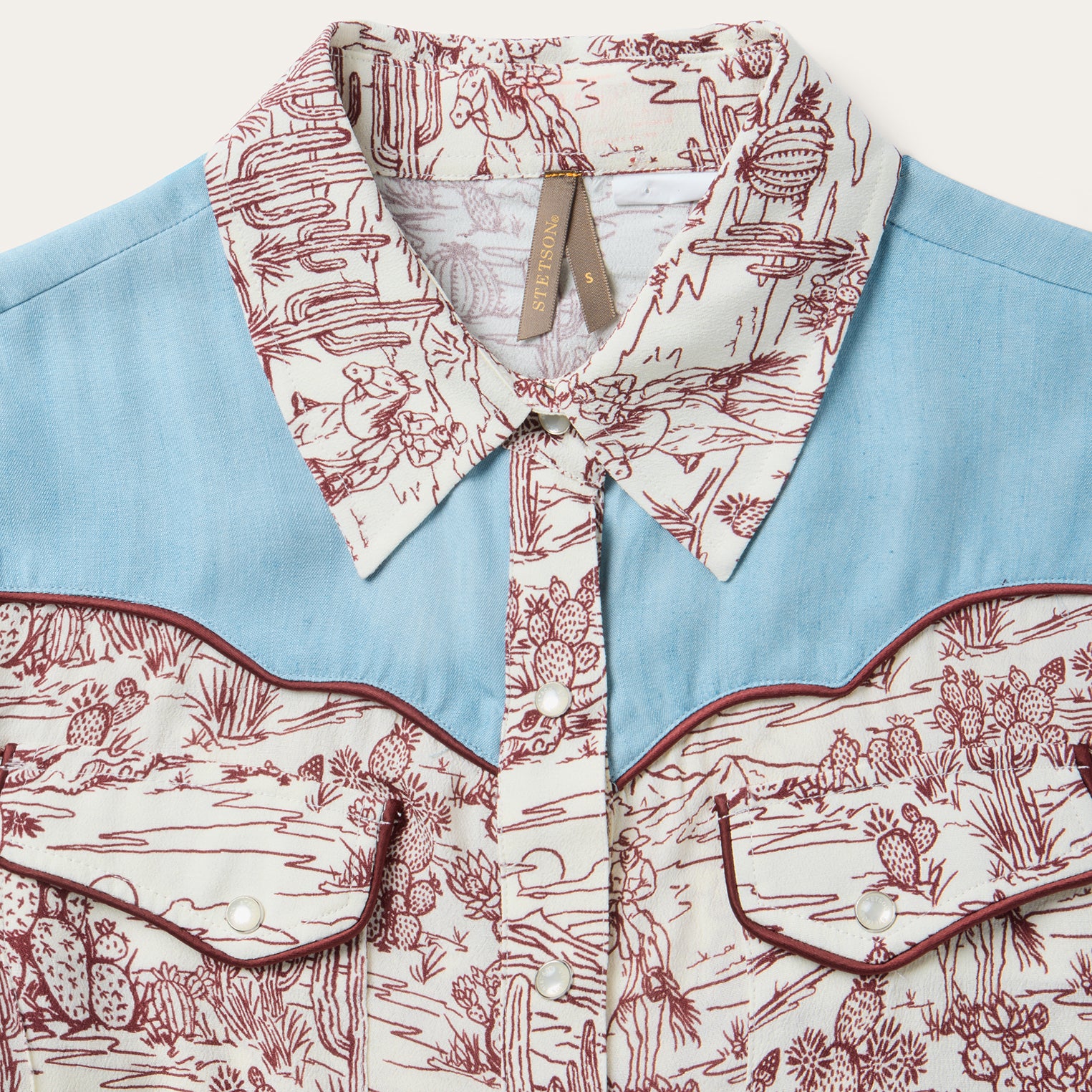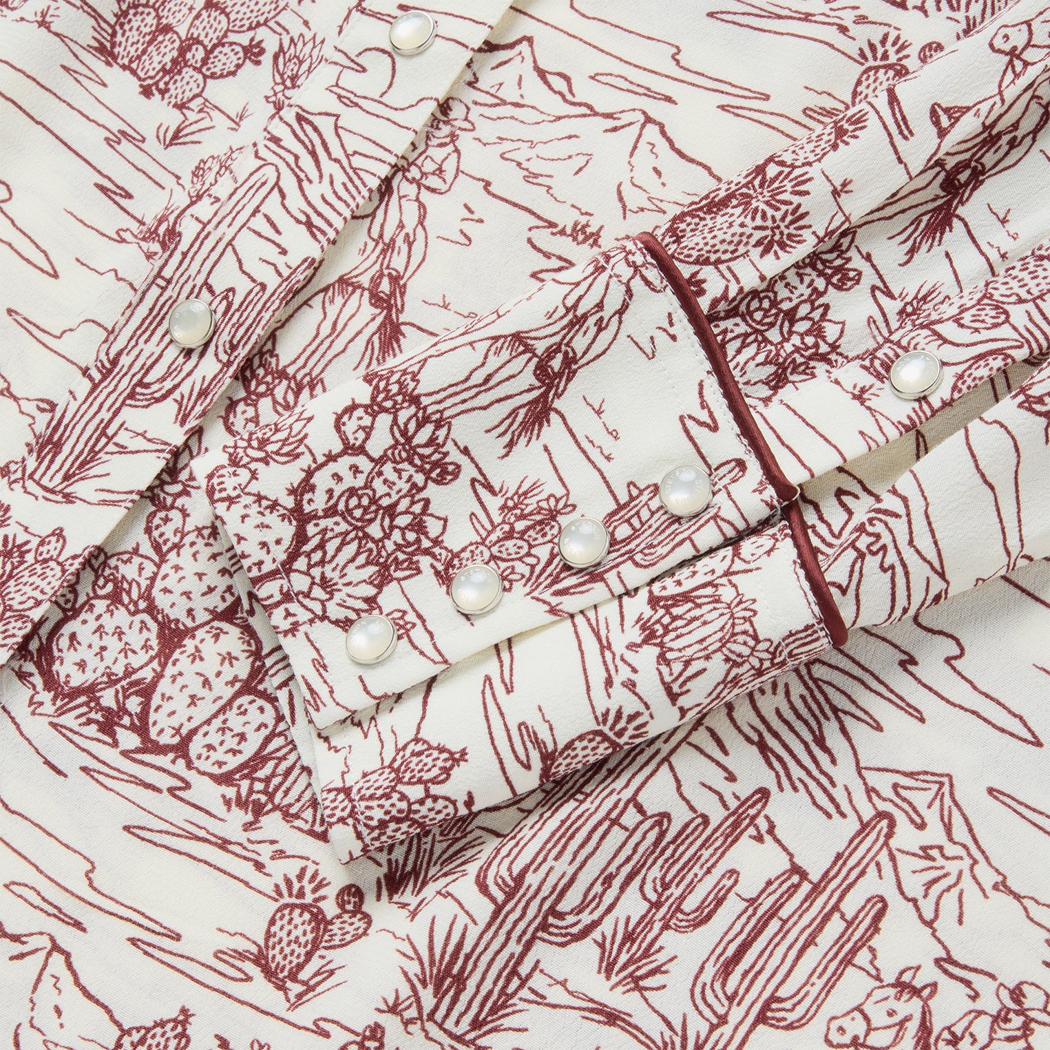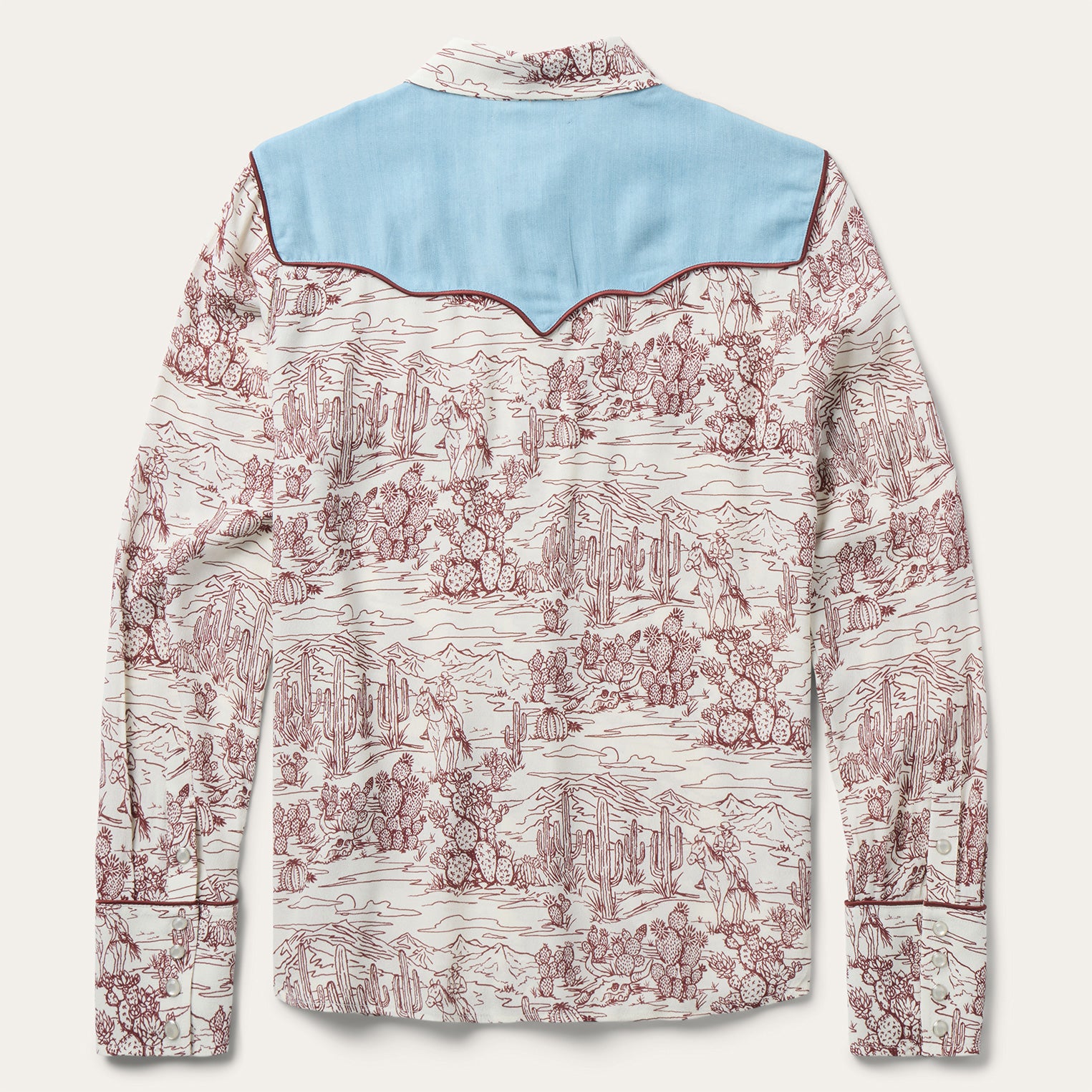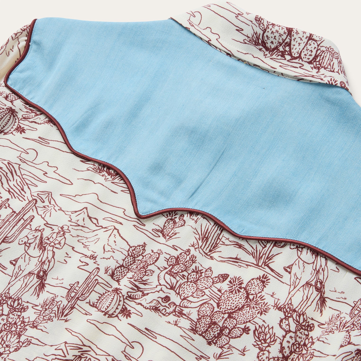 This statement-making western shirt features an intricate toile print inspired by desert landscapes, contrast denim front and back yokes and wine satin piping on its pocket flaps, yokes and cuffs.