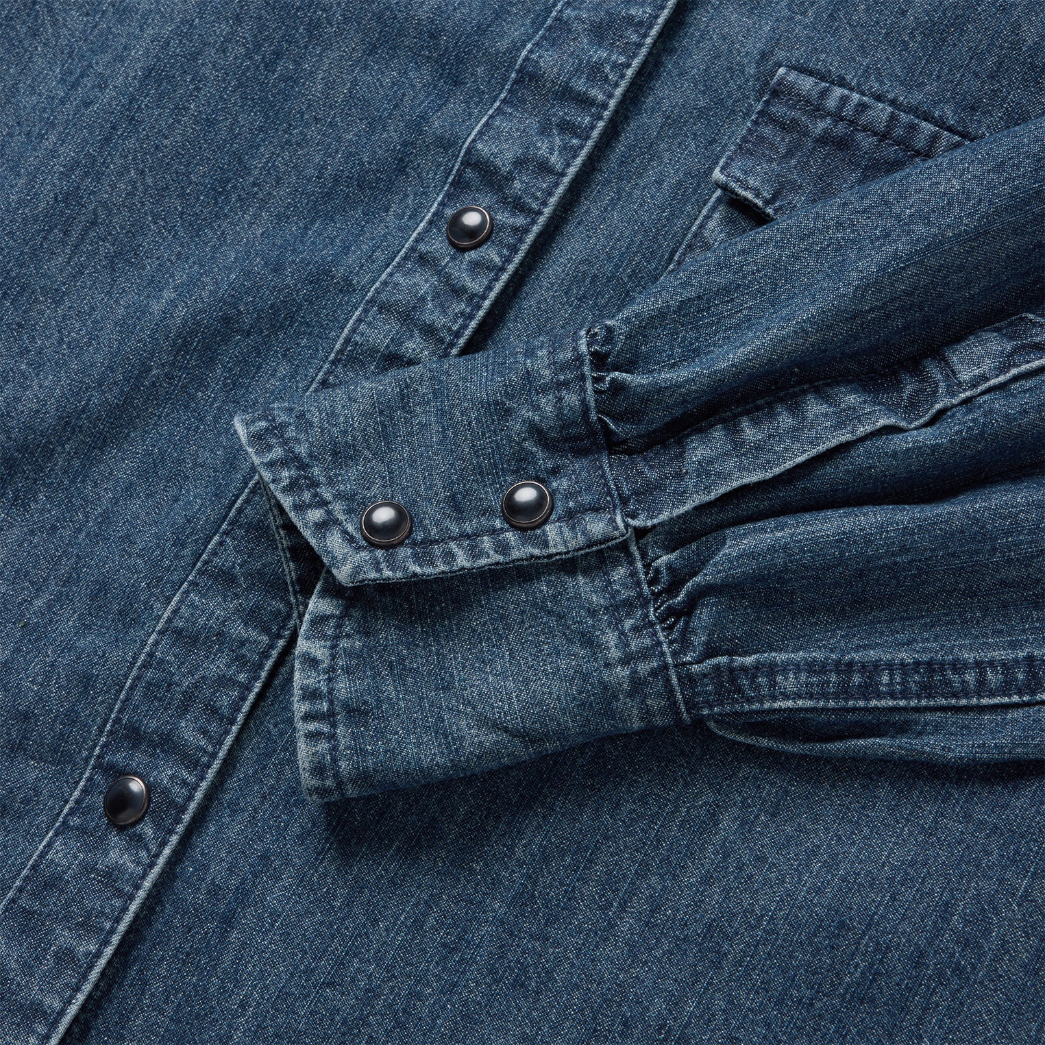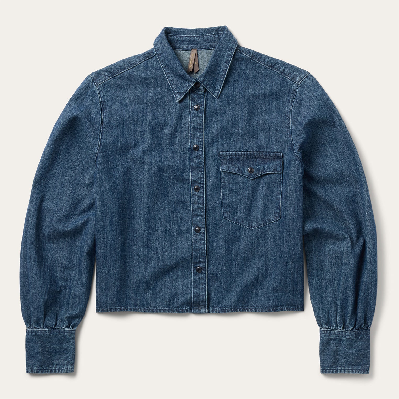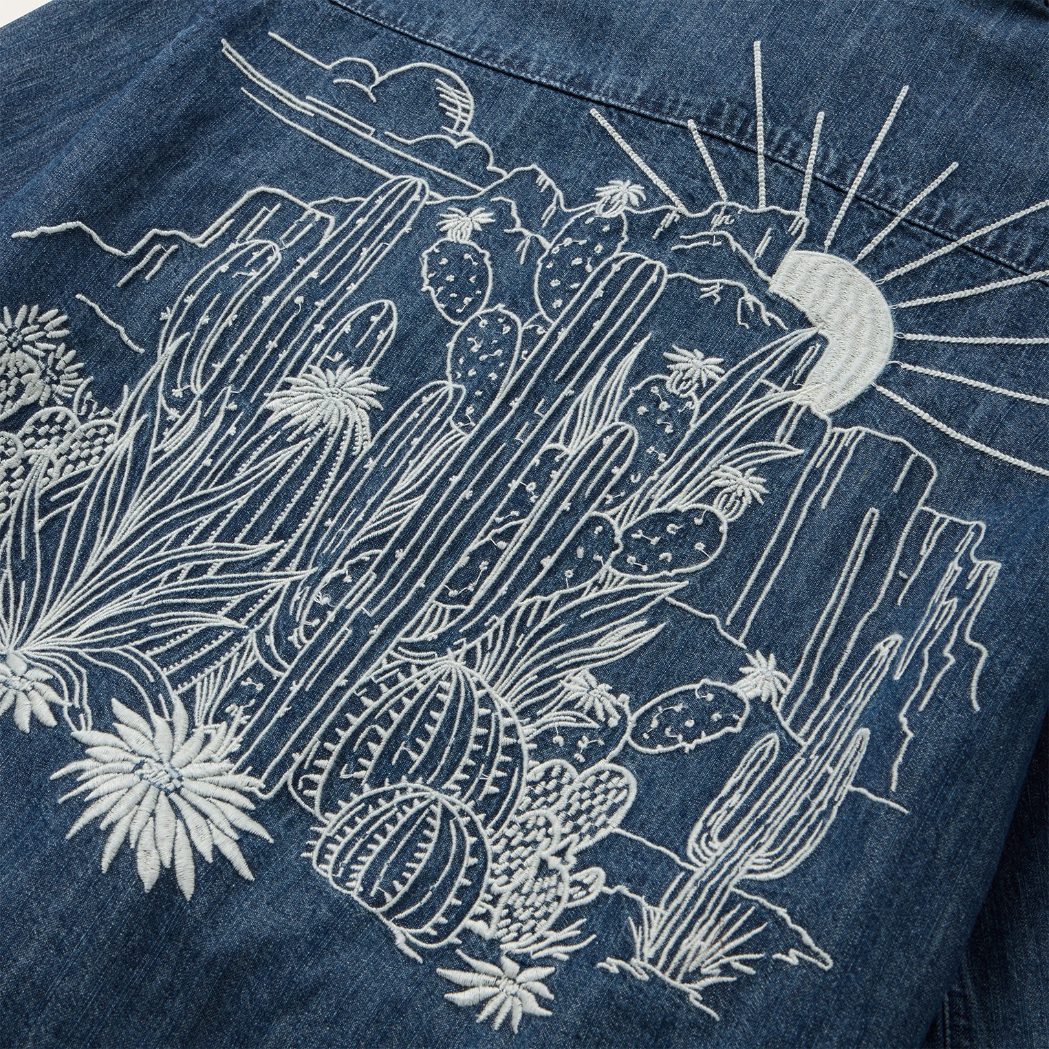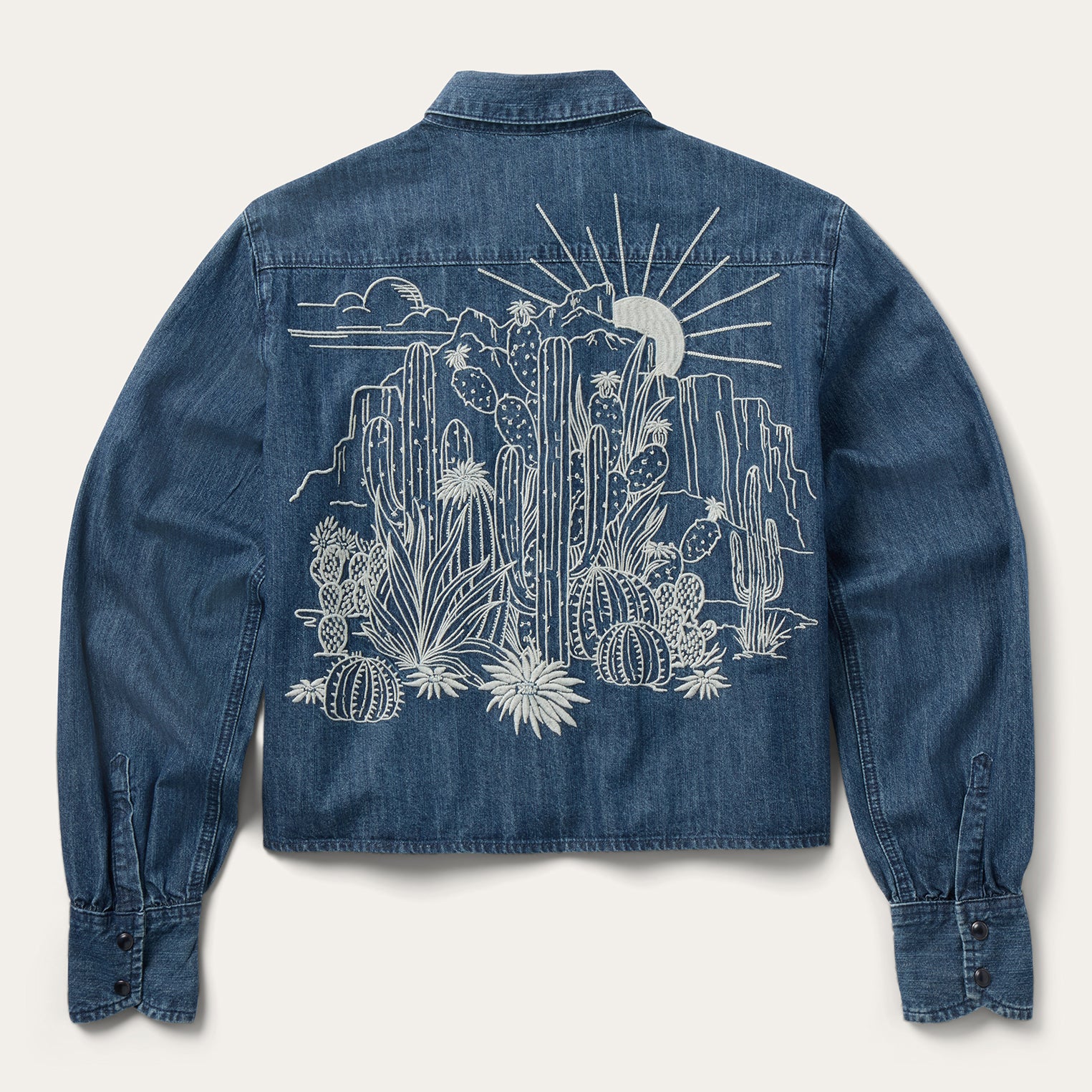 This cropped denim western shirt top is crafted from a soft cotton blend that’s made to get more comfortable over time. It has a single point left chest pocket with flaps, a straight back yoke, snap cuffs, a full snap front and intricate full scene embroidery on the back featuring a beautifully rendered desert landscape.