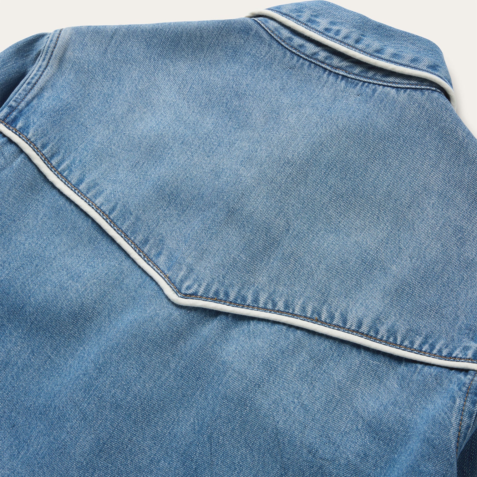 This western shirt is crafted from soft, sustainable 100% lyocell denim and features retro-style cream contrast piping at its yokes, collar, placket and pocket flaps. Cut in our flattering Boyfriend Fit, it has single point curved front and back yokes, a full snap front, four-snap deep cuffs and front faux pocket flaps.
