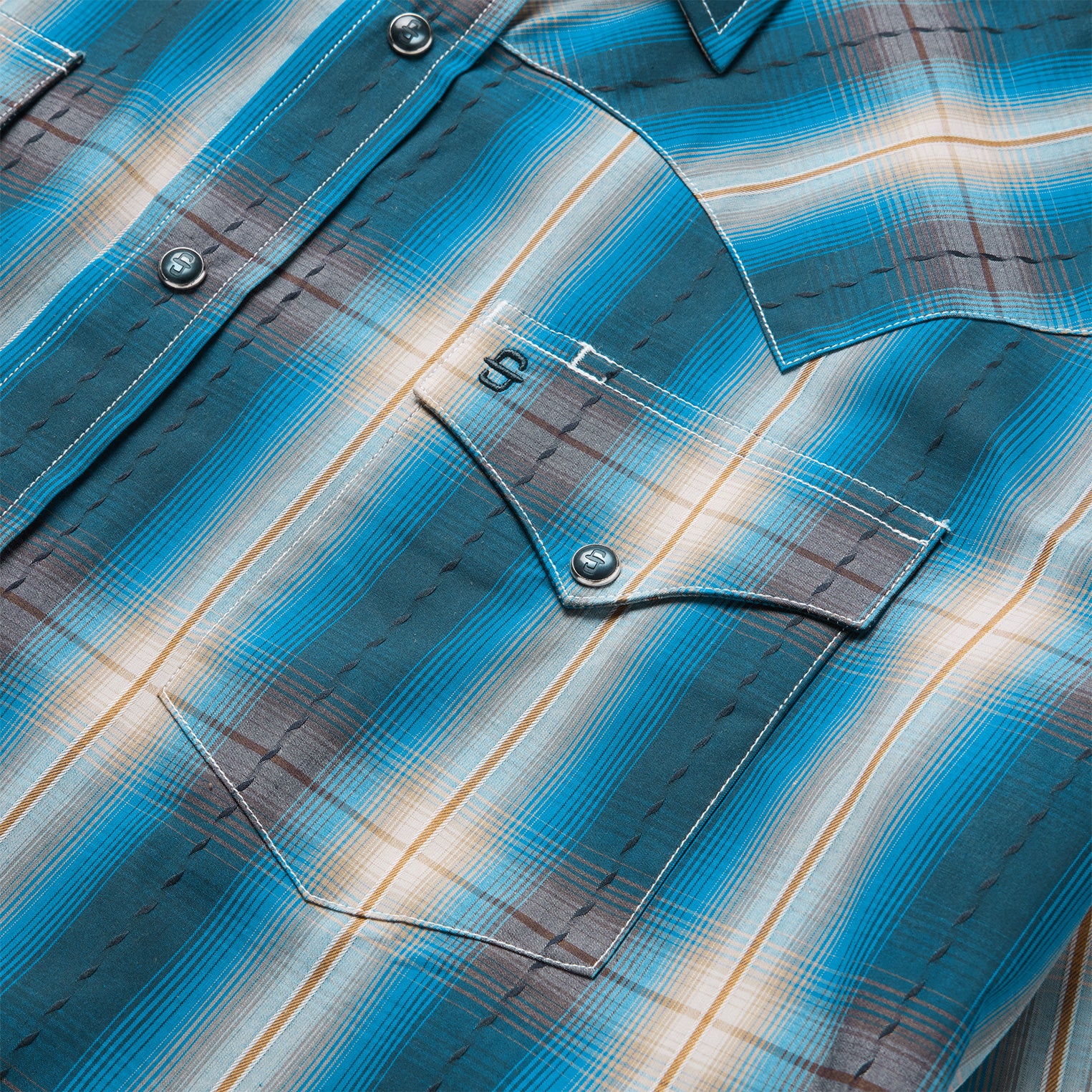Crafted from high-quality 100% cotton, the Marine Ombre Plaid Western Shirt features a yarn-dyed plaid woven with dobby and satin stitching for added texture. Classic western details include a deep one-point curved back yoke, opaque snap front, and three-snap cuffs. Multiple contrast inside trims lend extra character, while the Classic Fit offers full freedom of movement and a longer hem designed to stay tucked in while riding.