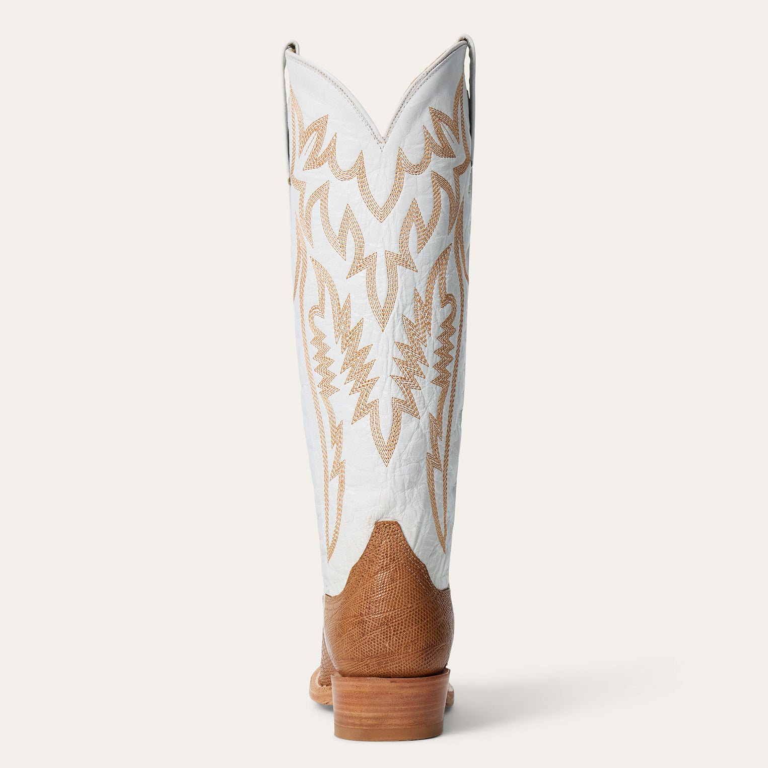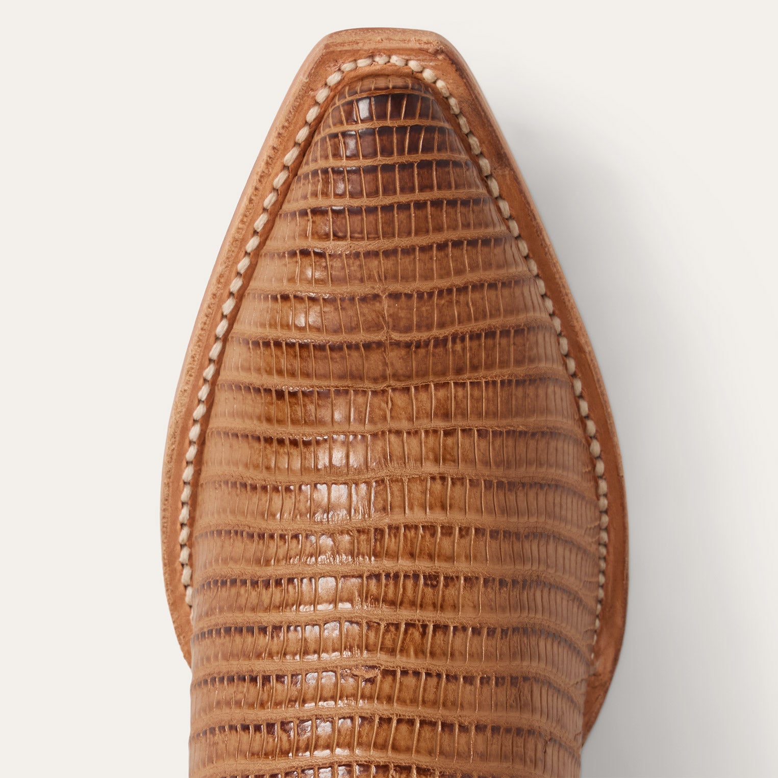 A statement-making western boot with elevated style, the Toni Boot features a full teju lizard vamp known for its distinctive scale pattern and subtle sheen. It’s paired with a 15” goat leather shaft embroidered with a unique stitch pattern, and finished with a stylish snip toe and hand-stacked leather heel. An all-leather sole, crafted with lemonwood pegs and brass nails, provides a firm foundation, while premium cowhide leather lining and a cushioned insole ensure all-day comfort and support.